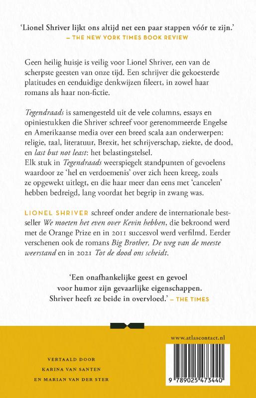 ‘Tegendraads’ is samengesteld uit de vele columns, essays en opiniestukken die Lionel Shriver schreef voor gerenommeerde Engelse en Amerikaanse media over een breed scala aan onderwerpen: religie, taal, literatuur, Brexit, het schrijverschap, ziekte, de dood, en ‘last but not least’: het belastingstelsel. Elk stuk in ‘Tegendraads’ weerspiegelt standpunten of gevoelens waardoor ze ‘hel en verdoemenis’ over zich heen kreeg, zoals ze opgewekt uitlegt, en die haar meer dan eens met ‘cancelen’ hebben bedreigd, lang voordat het begrip in zwang was. Geen heilig huisje is veilig voor een van de scherpste geesten van onze tijd. Een schrijver die gekoesterde platitudes en eenduidige denkwijzen fileert, in zowel haar romans als haar non-fictie.