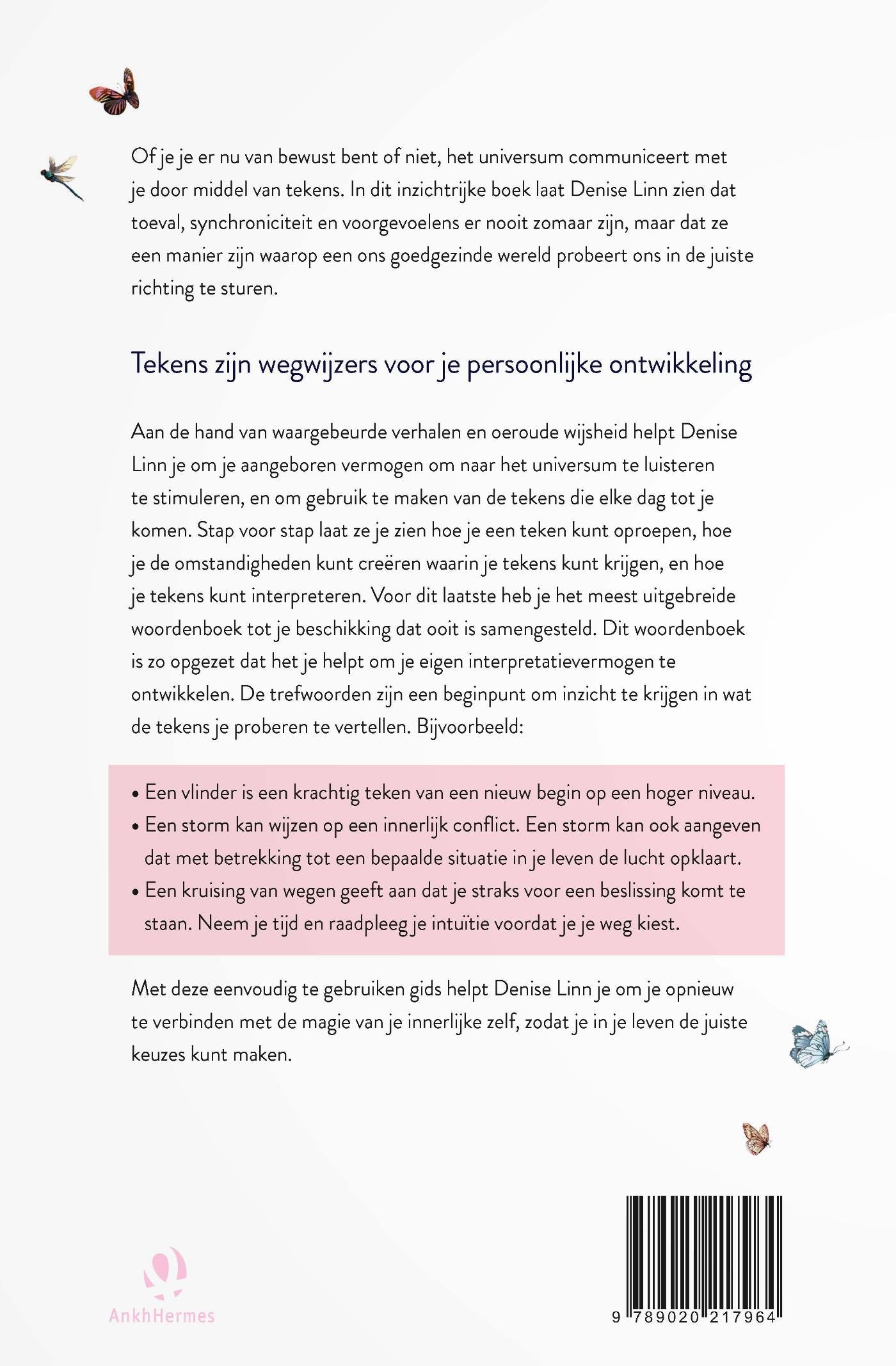 Aan de hand van waargebeurde verhalen en oeroude wijsheid helpt Denise Linn je om je aangeboren vermogen om naar het universum te luisteren te stimuleren, en om gebruik te maken van de tekens die elke dag tot je komen. Stap voor stap laat ze je zien hoe je een teken kunt oproepen, hoe je de omstandigheden kunt creëren waarin je tekens kunt krijgen, en hoe je tekens kunt interpreteren. Voor dit laatste heb je het meest uitgebreide woordenboek tot je beschikking dat ooit is samengesteld. Dit woordenboek is zo opgezet dat het je helpt om je eigen interpretatievermogen te ontwikkelen. De trefwoorden zijn een beginpunt om inzicht te krijgen in wat de tekens je proberen te vertellen.
