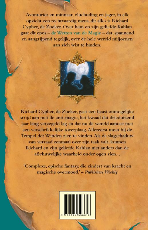 Richard Cypher, de Zoeker, gaat een haast onmogelijke strijd aan met de anti-magie, het kwaad dat drieduizend jaar lang verzegeld lag en dat nu de wereld aantast met een verschrikkelijke toverplaag. Allereerst moet hij de Tempel der Winden zien te vinden. Als de slagschaduw van verraad eenmaal over zijn taak valt, kunnen Richard en zijn geliefde Kahlan niet anders dan de afschuwelijke waarheid onder ogen zien...