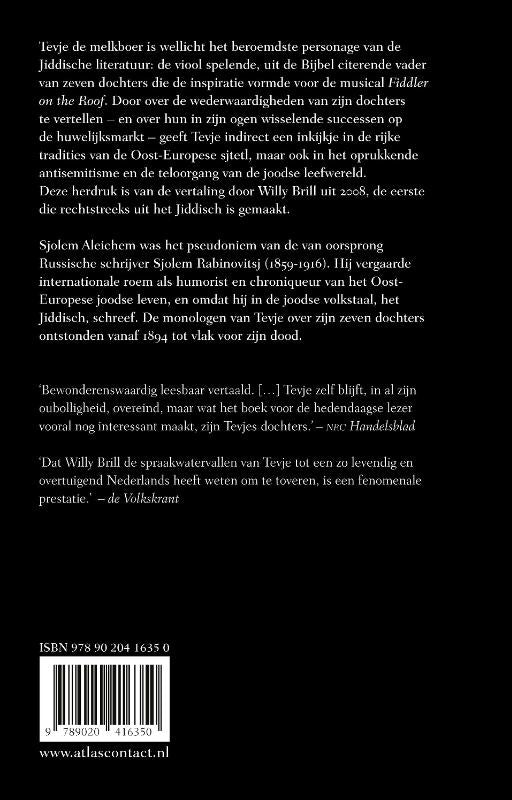 Tevje de melkboer is wellicht het beroemdste personage van de Jiddische literatuur: de viool spelende, uit de Bijbel citerende vader van zeven dochters die de inspiratie vormde voor de musical Fiddler on the Roof. Door over de wederwaardigheden van zijn dochters te vertellen – en over hun in zijn ogen wisselende successen op de huwelijksmarkt – geeft Tevje indirect een inkijkje in de rijke tradities van de Oost-Europese sjtetl, maar ook in het oprukkende antisemitisme en de teloorgang van de joodse leefwereld.