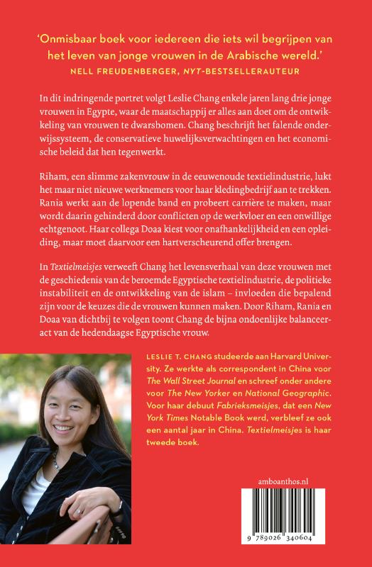 In Textielmeisjes verweeft Chang de levensverhalen van deze vrouwen met de geschiedenis van de beroemde Egyptische textielindustrie, de politieke instabiliteit en de ontwikkeling van de islam – invloeden die bepalend zijn voor de keuzes die zij kunnen maken. Door Riham, Rania en Doaa van dichtbij te volgen toont Chang de bijna ondoenlijke balanceeract van de hedendaagse Egyptische vrouw.