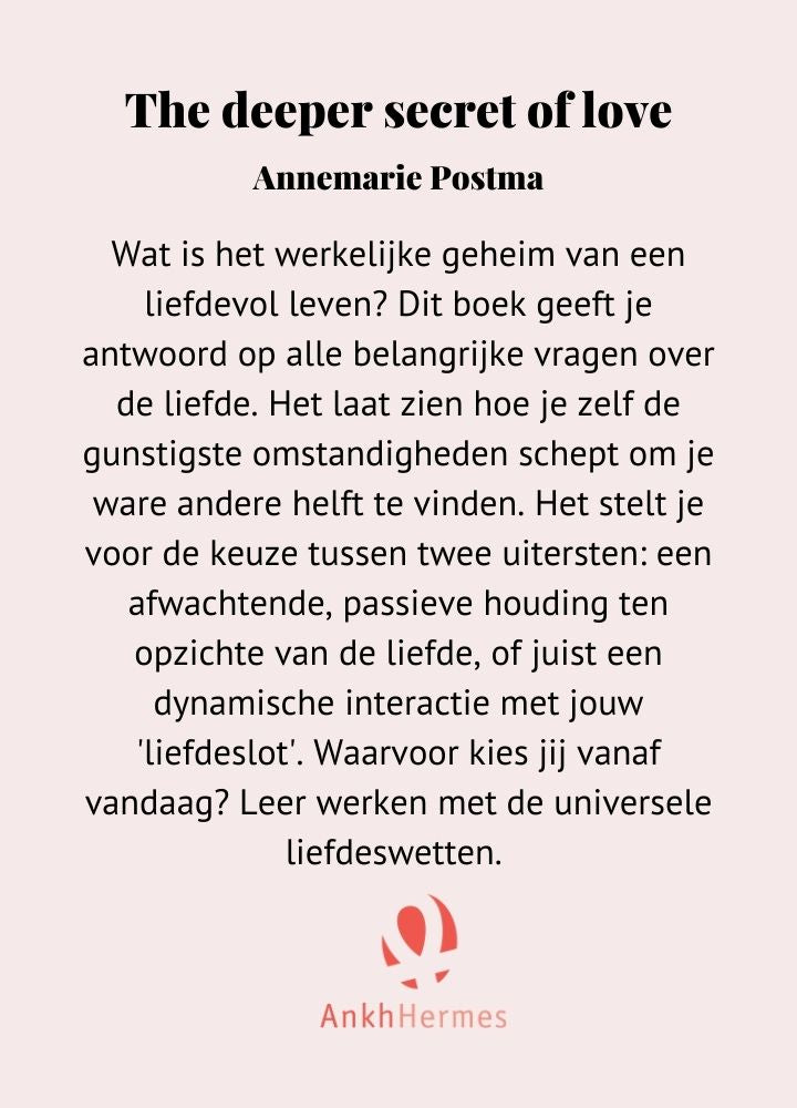 Leer werken met de universele liefdeswetten door The deeper secret of love van Annemarie Postma en verander jouw 'magneet' om het wonder van de liefde zelf tot leven te wekken.