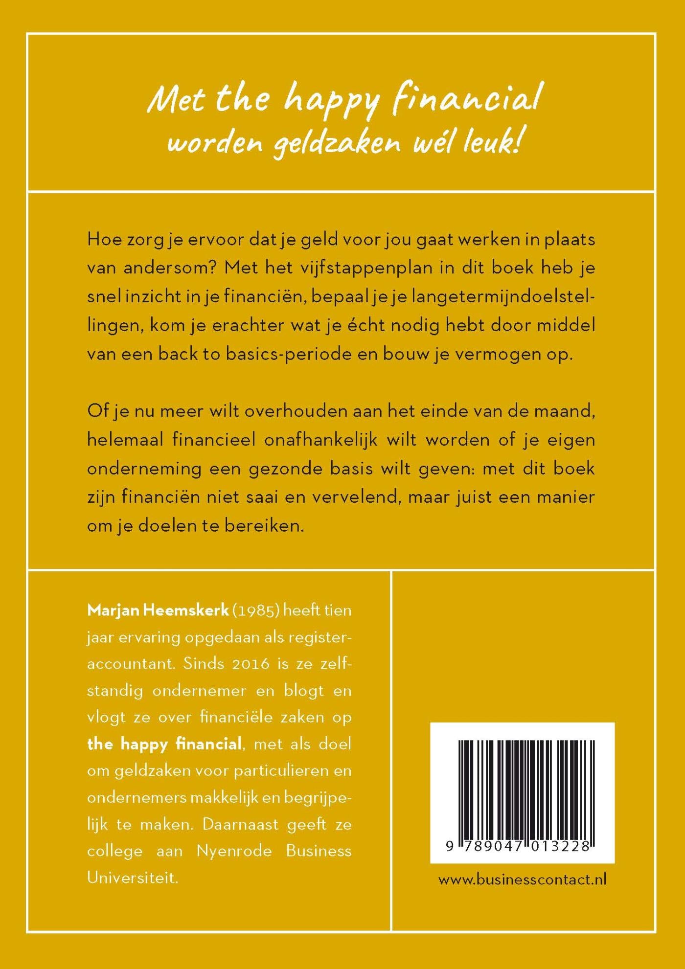 In ‘The happy financial’ laat Marjan Heemskerk je zien hoe je ervoor kan zorgen dat geld voor jou gaat werken in plaats van andersom. Met het vijfstappenplan in dit boek heb je snel inzicht in je financiën, bepaal je je langetermijndoelstellingen, kom je erachter wat je écht nodig hebt door middel van een back to basics-periode en bouw je vermogen op.