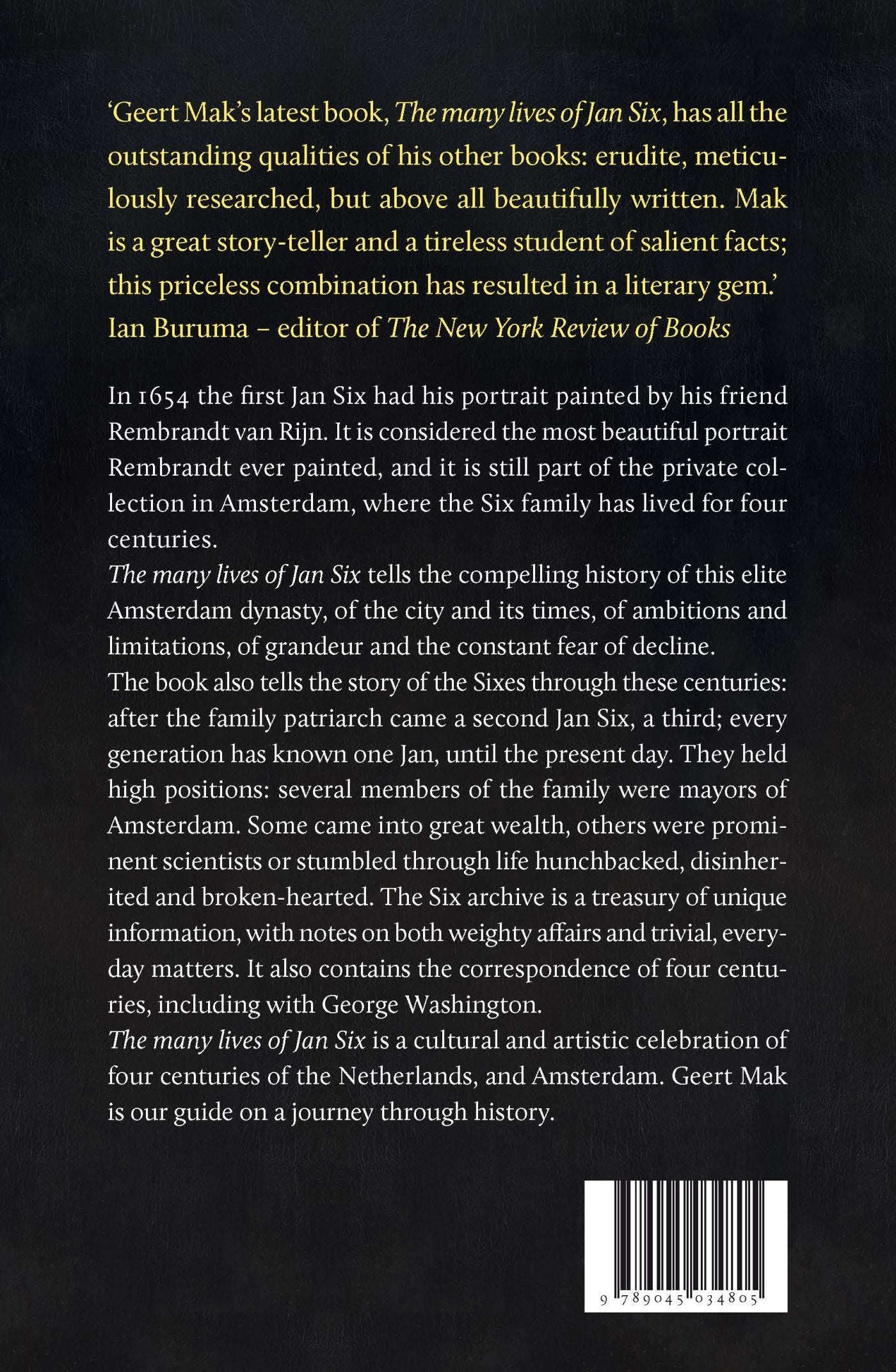 In 1654 the first Jan Six had his portrait painted by his friend Rembrandt van Rijn. It is considered the most beautiful portrait Rembrandt ever painted, and it is still part of the private collection in Amsterdam, where the Six family has lived for four centuries. The many lives of Jan Six tells the compelling history of this elite Amsterdam dynasty, of the city and its times, of ambitions and limitations, of grandeur and the constant fear of decline. The book also tells the story of the Sixes through these centuries: after the family patriarch came a second Jan Six, a third; every generation has known one Jan, until the present day. They held high positions: several members of the family were mayors of Amsterdam. Some came into great wealth, others were prominent scientists or stumbled through life hunchbacked, disinherited and broken-hearted. The Six archive is a treasury of unique information, with notes on both weighty affairs and trivial, everyday matters. It also contains the correspondence of four centuries, including with George Washington.