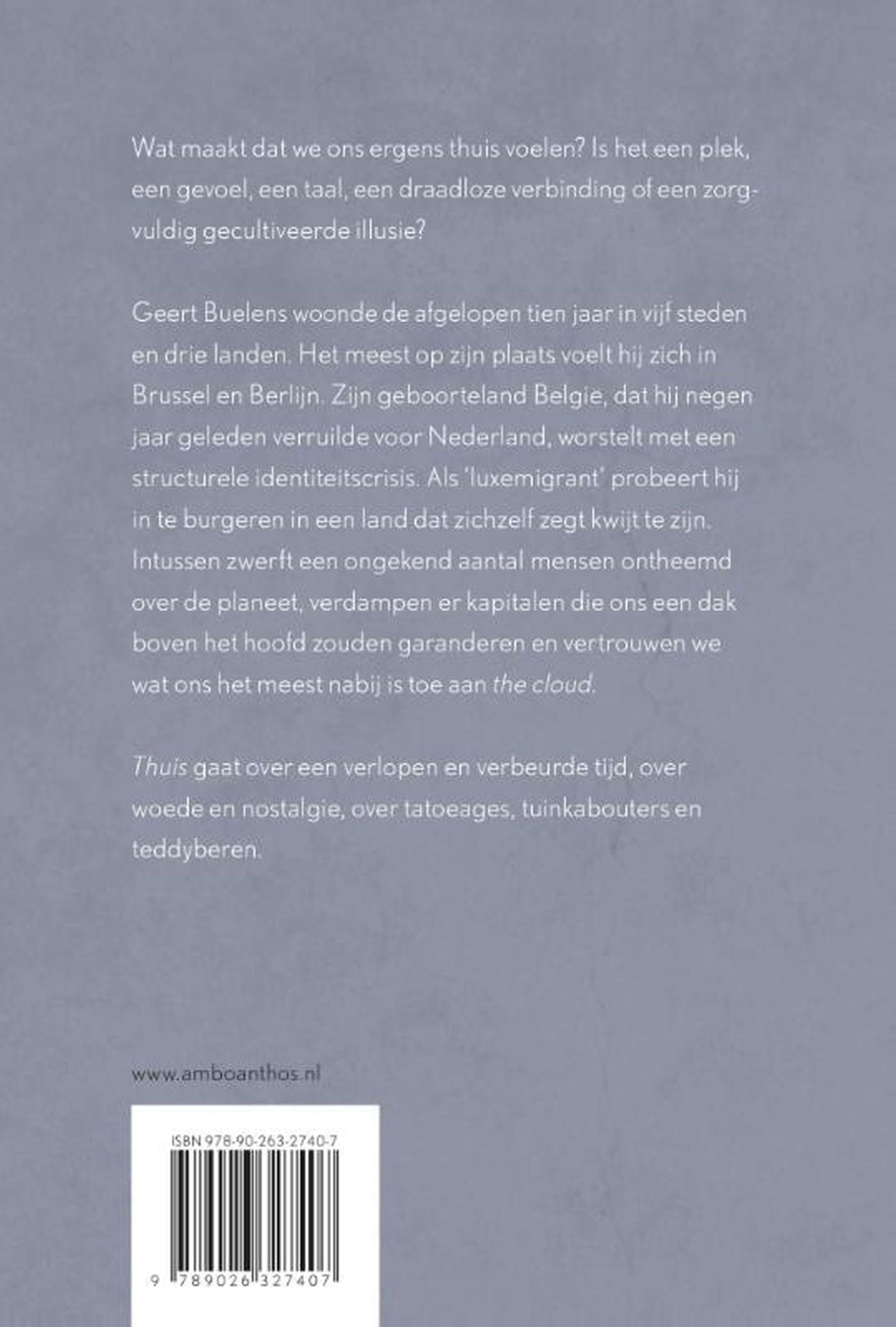 Thuis is de nieuwe poëziebundel van Geert Buelens. In deze gedichten stelt Buelens de vraag wat maakt dat we ons ergens thuis voelen. Is het een plek, een gevoel, een taal, een draadloze verbinding of een zorgvuldig gecultiveerde illusie? Thuis gaat over een verlopen en verbeurde tijd, over woede en nostalgie, over tatoeages, tuinkabouters en teddyberen.