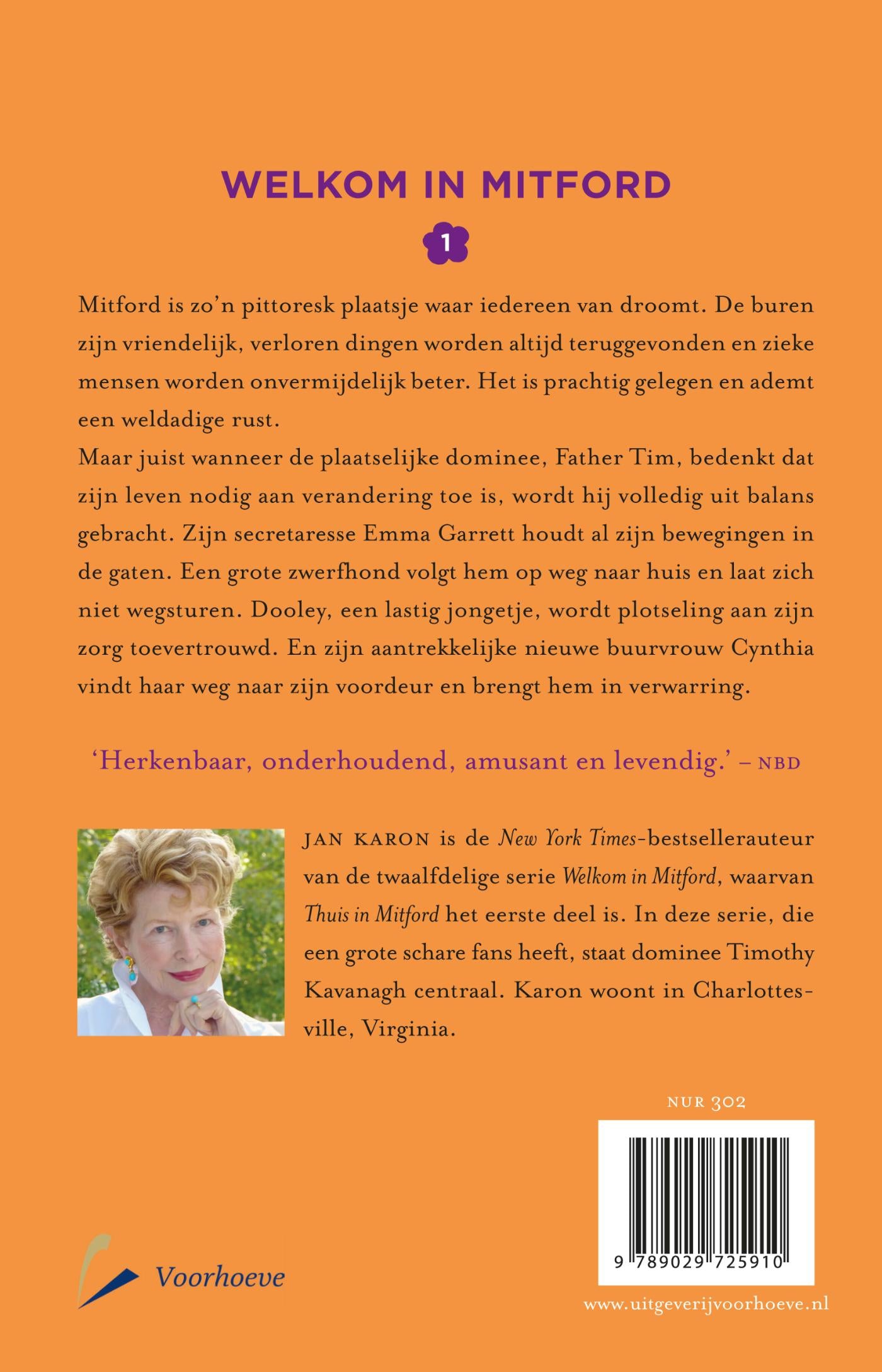 ‘Thuis in Mitford’ van Jan Karon is het eerste deel en draait om het stadje Mitford, zo'n pittoresk plaatsje waar iedereen van droomt. De buren zijn vriendelijk, verloren dingen worden altijd teruggevonden, en zieke mensen worden onvermijdelijk beter. Het is prachtig gelegen en ademt een weldadige rust. Maar juist wanneer de plaatselijke dominee, Father Tim, bedenkt dat zijn leven nodig aan verandering toe is, wordt hij volledig uit balans gebracht. Hij wordt door allerlei vreemde gebeurtenissen overvallen. Een grote zwerfhond volgt hem op weg naar huis en laat zich niet wegsturen. Een lastig jongetje wordt plotseling aan zijn zorg toevertrouwd. En zijn aantrekkelijke nieuwe buurvrouw vindt haar weg naar zijn voordeur, en brengt hem in verwarring.‘Er brandt nog licht" is het tweede deel en "De groene heuvels" is het derde deel van een serie over het stadje Mitford.