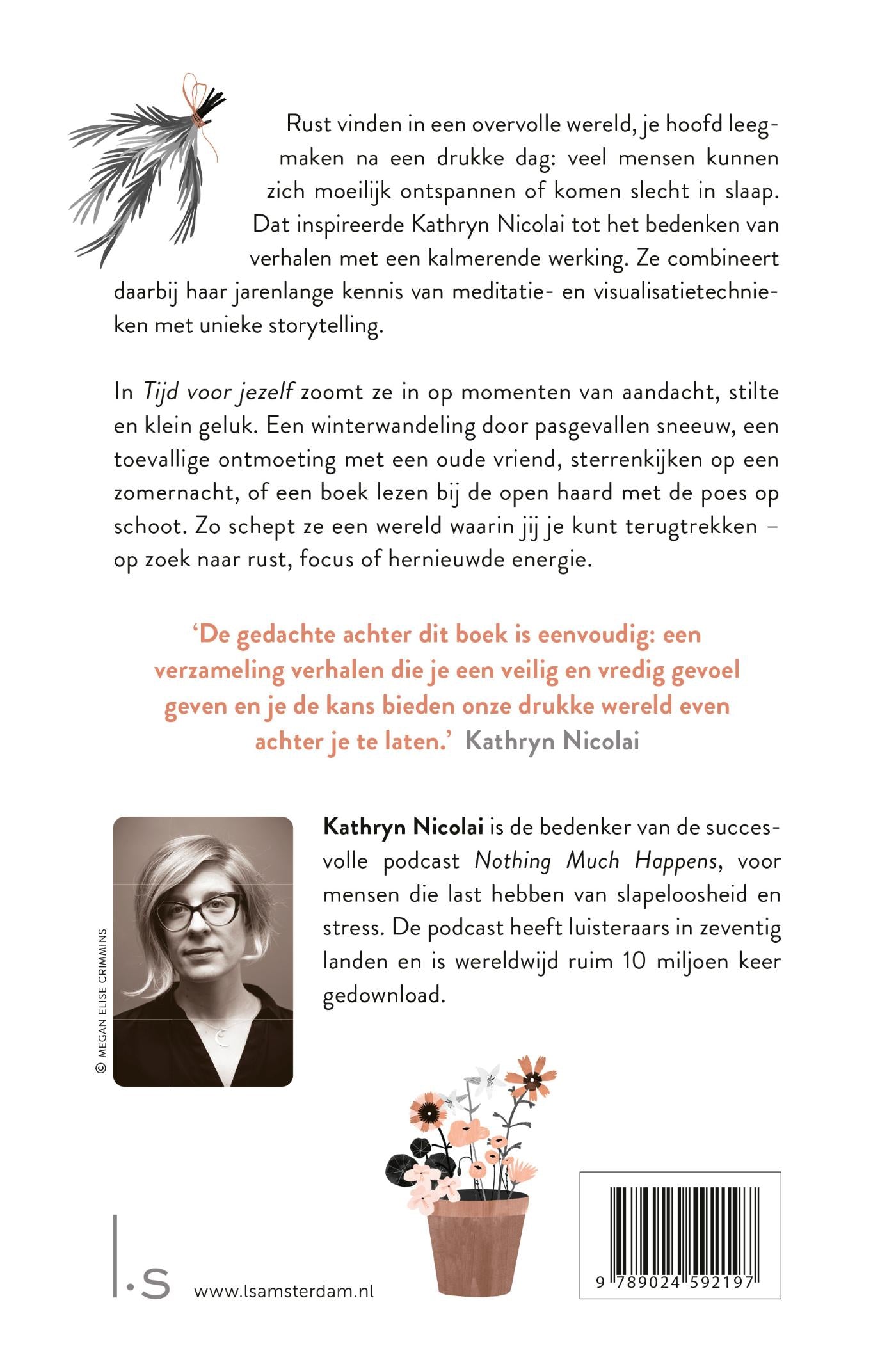 In Tijd voor jezelf schept Kathryn Nicolai, de bedenker van de succesvolle podcast Nothing Much Happens, met behulp van korte verhalen een wereld waarin de lezer zich kan terugtrekken, op zoek naar rust, focus of hernieuwde energie. Rust vinden in een overvolle wereld, je hoofd leegmaken na een volle dag: voor veel mensen is dit een onmogelijke opdracht. Velen onder ons kunnen zich moeilijk ontspannen of komen slecht in slaap. Dat inspireerde Kathryn Nicolai tot het bedenken van verhalen met een kalmerende werking, waarbij ze haar jarenlange kennis van meditatie- en visualisatietechnieken combineert met storytelling. In Tijd voor jezelf zoomt Kathryn Nicolai in op momenten van klein geluk. Een winterwandeling door pas gevallen sneeuw, een toevallige ontmoeting met een oude vriend, sterren kijken op een zomernacht of een boek lezen bij de open haard met de poes op je schoot. ‘Een aangename, heilzame en bijna magische ervaring voor als het je even allemaal te veel wordt. Een balsem voor de geest.’ Geekmom.com ‘Het ultieme recept tegen een druk leven en een vol hoofd.’ The Evening Standard