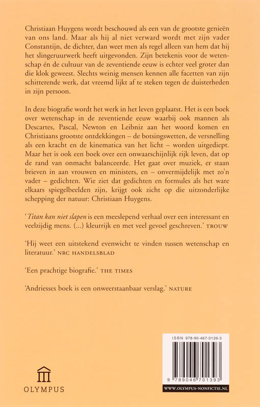 Christiaan Huygens wordt beschouwd als een van de grootste genieën van ons land. Maar als hij al niet verward wordt met zijn vader Constantijn, de dichter, dan weten we vaak alleen van hem dat hij het slingeruurwerk heeft uitgevonden. Zijn betekenis voor de wetenschap én de cultuur van de zeventiende eeuw is echter veel groter geweest dan die klok. In deze biografie wordt zijn werk in het leven geplaatst. Het is een boek over wetenschap in de zeventiende eeuw waarbij ook mannen als Descartes, Pascal, Newton en Leibniz aan het woord komen, en Huygens’ grootste ontdekkingen – de botsingswetten, de versnelling als een kracht en de kinematica van het licht - worden uitgediept. Maar het is ook een boek over een onwaarschijnlijk rijk leven, dat op de rand van onmacht balanceerde. Het gaat over muziek, er staan brieven in aan vrouwen en ministers, en – onvermijdelijk met zo’n vader – gedichten. Wie ziet dat gedichten en formules als het ware elkaars spiegelbeelden zijn, krijgt ook zicht op die uitzonderlijke schepping der natuur: Christiaan Huygens.
