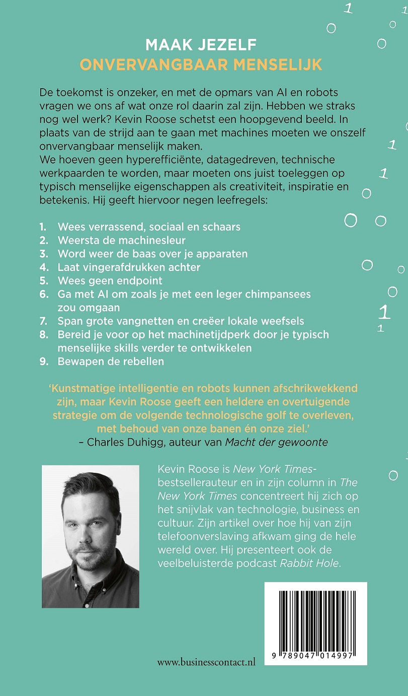 Kevin Roose schetst in ‘Toekomstroof’ een hoopgevend beeld over de onzekere toekomst. Roose geeft antwoord o de belangrijke vragen of we straks nog wel werk zullen hebben en wat onze rol zal zijn in de opmars van AI en robots. In laats van de strijd aan te gaan met machines moeten we onszelf onvervangbaar menselijk maken. We hoeven geen hyperefficiënte, data gedreven , technische werkaarden te worden, maar moeten ons juist toeleggen op typisch menselijke eigenschapen als creativiteit, inspiratie en betekenis. Hij geeft hiervoor negen leefregels:
