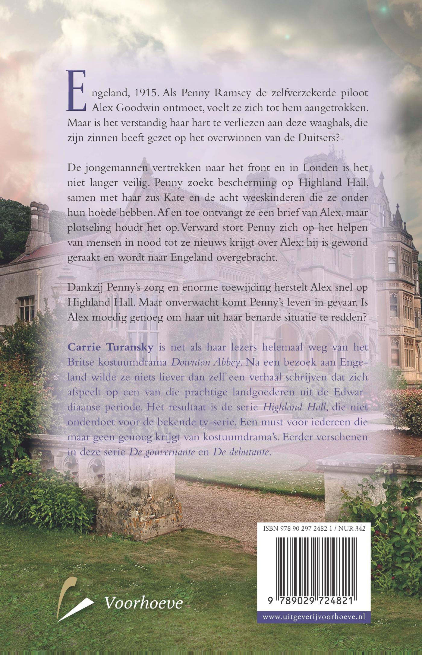 Carrie Turansky is net als haar lezers helemaal weg van het Britse kostuumdrama Downton Abbey. Na een bezoek aan Engeland wilde ze niets liever dan zelf een verhaal schrijven dat zich afspeelt op een van die prachtige landgoederen uit de Edwardiaanse periode. Het resultaat is de serie Highland Hall, voor iedereen die maar geen genoeg krijgt van kostuumdrama’s. Eerder verschenen in deze serie ‘De gouvernante’ en ‘De debutante’.