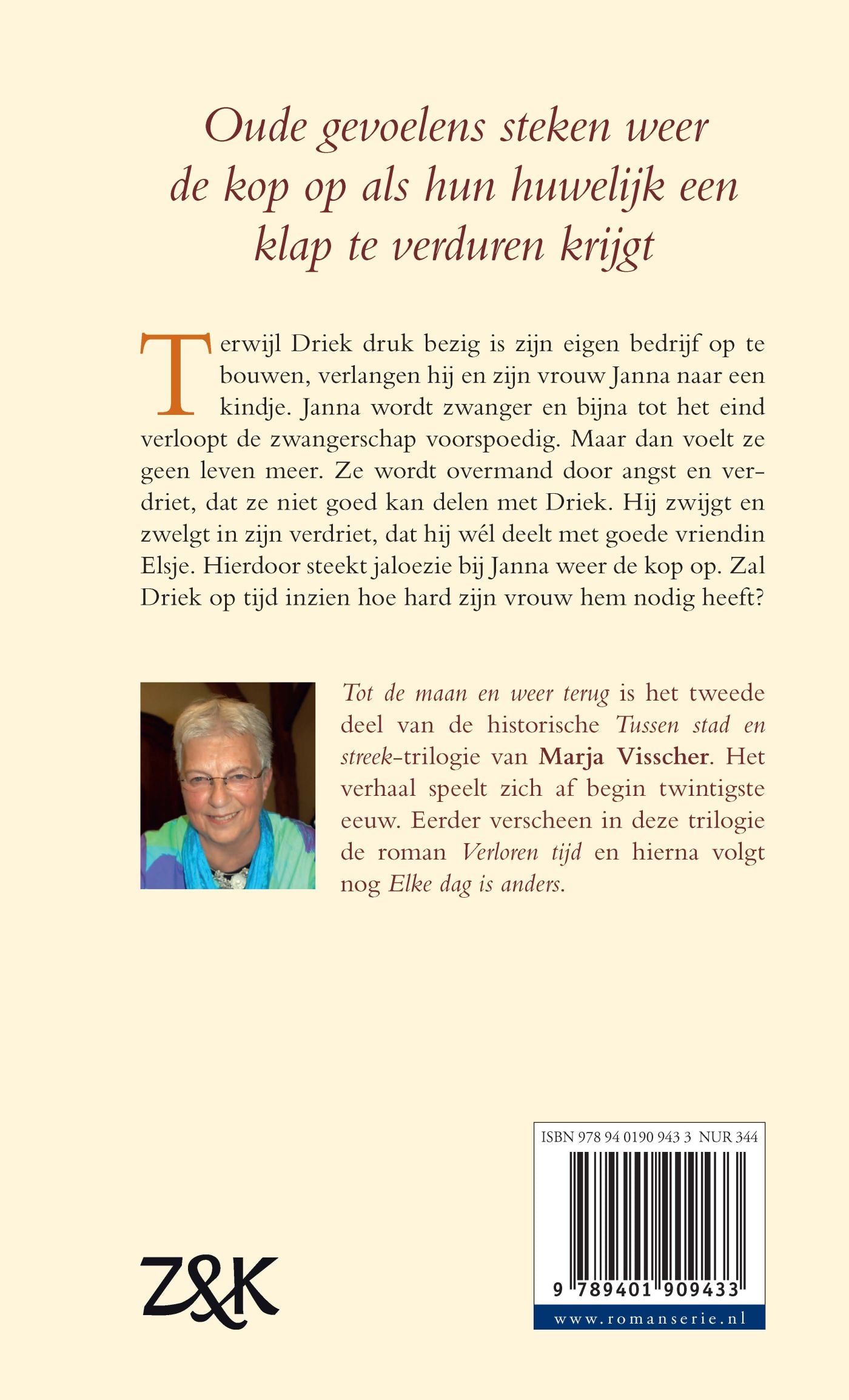 Tot de maan en weer terug is het tweede deel in een historische streekromantrilogie van Marja Visscher. Terwijl Driek druk bezig is om zijn eigen bedrijf op te bouwen, verlangen hij en zijn vrouw Janna naar een kindje. Janna wordt zwanger en bijna tot het eind verloopt de zwangerschap voorspoedig. Maar dan voelt ze ineens geen leven meer. Ze wordt overmand door angst en verdriet, dat ze met Driek niet kan delen. Hij zwijgt en zwelgt in zijn verdriet, terwijl hij wél zijn hart uitstort bij zijn goede vriendin Elsje. Marja Visscher schreef met Tot de maan en weer terug een aangrijpend en bijzonder menselijk verhaal.