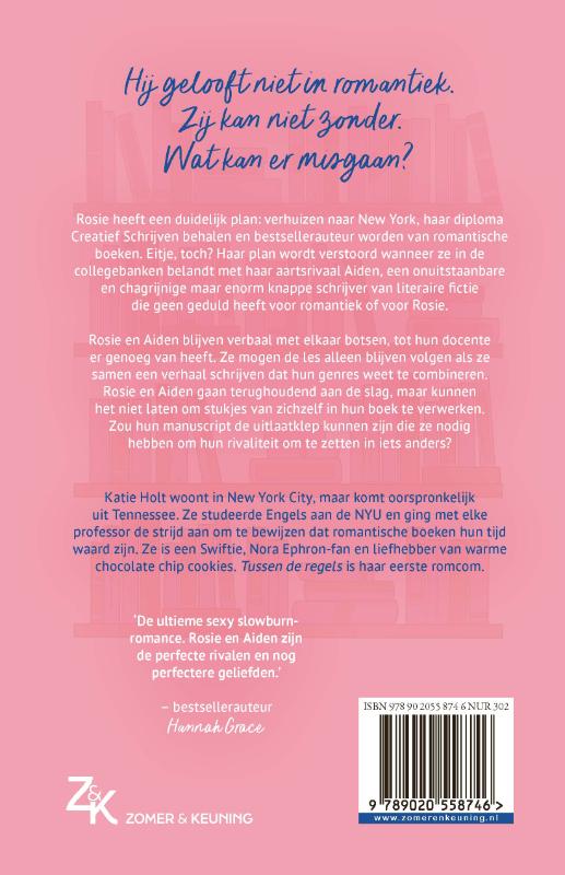 Rosie heeft haar hele toekomst al uitgestippeld: verhuizen naar New York, haar diploma Creatief Schrijven behalen en bestsellerauteur worden van romantische boeken. Maar haar plan wordt flink verstoord wanneer ze in de klas belandt met Aiden, een knappe, maar chagrijnige schrijver van literaire fictie die helemaal geen zin heeft in romantiek – of in Rosie. Toch moeten ze samenwerken aan een roman die hun genres combineert. Zou dit manuscript de kans zijn om hun wederzijdse aantrekkingskracht te ontdekken? ‘Tussen de regels’ van Katie Holt is de perfecte romance voor de fans van Emily Henry.