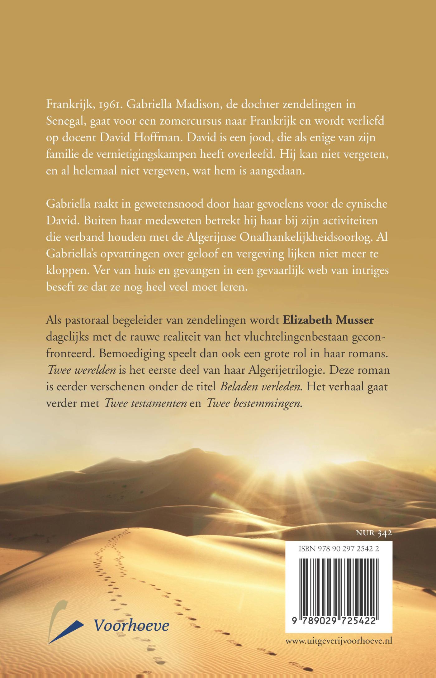 De historische roman ‘Twee werelden’ van Elizabeth Musser is het eerste deel in haar serie over de Algerijnse Onafhankelijkheidsoorlog. Frankrijk, 1961. Gabriëlle Madison, de dochter van een naar Senegal uitgezonden zendingsechtpaar, komt voor het volgen van een zomercursus naar Frankrijk en wordt verliefd op docent David Hoffman. David is een jood, die als enige van zijn familie de vernietigingskampen heeft overleefd. Hij kan niet vergeten, en al helemaal niet vergeven, wat hem is aangedaan. Gabriëlle raakt in gewetensnood door haar gevoelens voor deze cynische jongeman. Buiten haar medeweten betrekt hij haar bij zijn activiteiten die verband houden met de Algerijnse Onafhankelijkheidsoorlog. Al Gabriëlles opvattingen over geloof en vergeving lijken niet meer te kloppen. Ver van huis en gevangen in een gevaarlijk web van intriges beseft ze dat ze nog heel veel moet leren. ‘Twee werelden’ verscheen eerder onder de titel ‘Beladen verleden’. De serie gaat verder met ‘Twee testamenten’ en ‘Twee bestemmingen’.