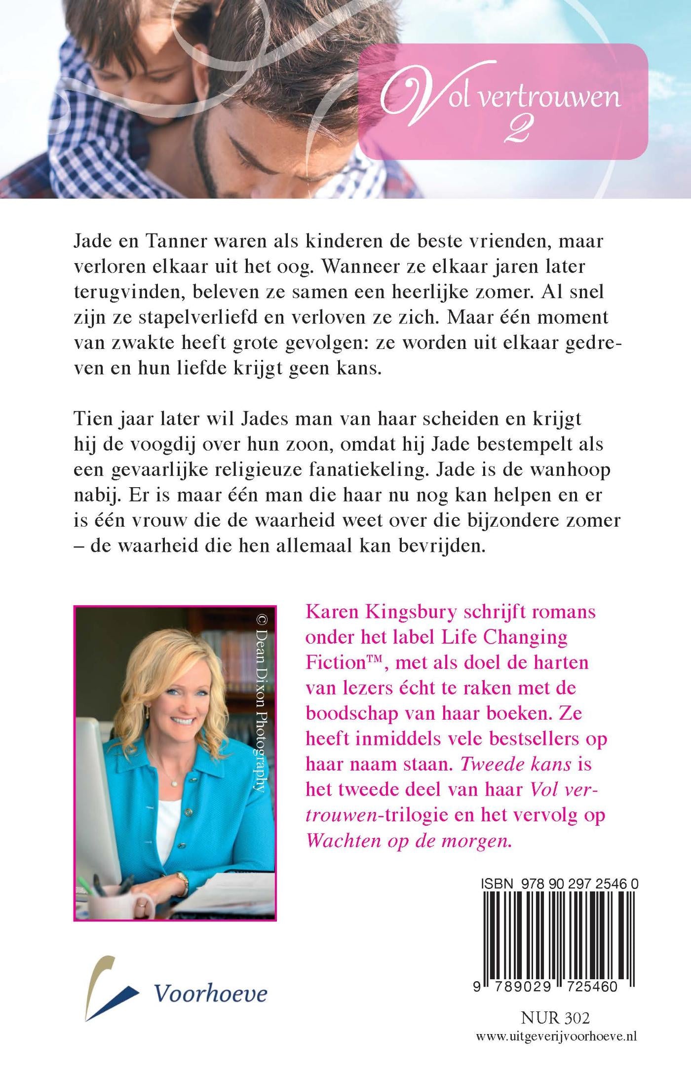 ‘Tweede kans’ van Karen Kingsbury: een roman over een aangrijpende liefdesgeschiedenis. Jade en Tanner waren als kinderen de beste vrienden, maar verloren elkaar uit het oog. Wanneer ze elkaar jaren later terugvinden, beleven ze samen een heerlijke zomer. Al snel zijn ze stapelverliefd en verloven ze zich, maar één moment van zwakte heeft grote gevolgen: ze worden uit elkaar gedreven en hun liefde krijgt geen kans. Tien jaar later wil Jades man van haar scheiden en krijgt hij de voogdij over hun zoon, omdat hij Jade bestempelt als een gevaarlijke religieuze fanatiekeling. Jade is de wanhoop nabij. Er is maar één man die haar nu nog kan helpen en er is één vrouw die de waarheid weet over die bijzondere zomer – de waarheid die hen allemaal kan bevrijden. ‘Tweede kans’ is het tweede deel in de Vol vertrouwen-trilogie. Het eerste deel is ‘Wachten op de morgen’ en het derde deel ‘Kostbaar geschenk’.