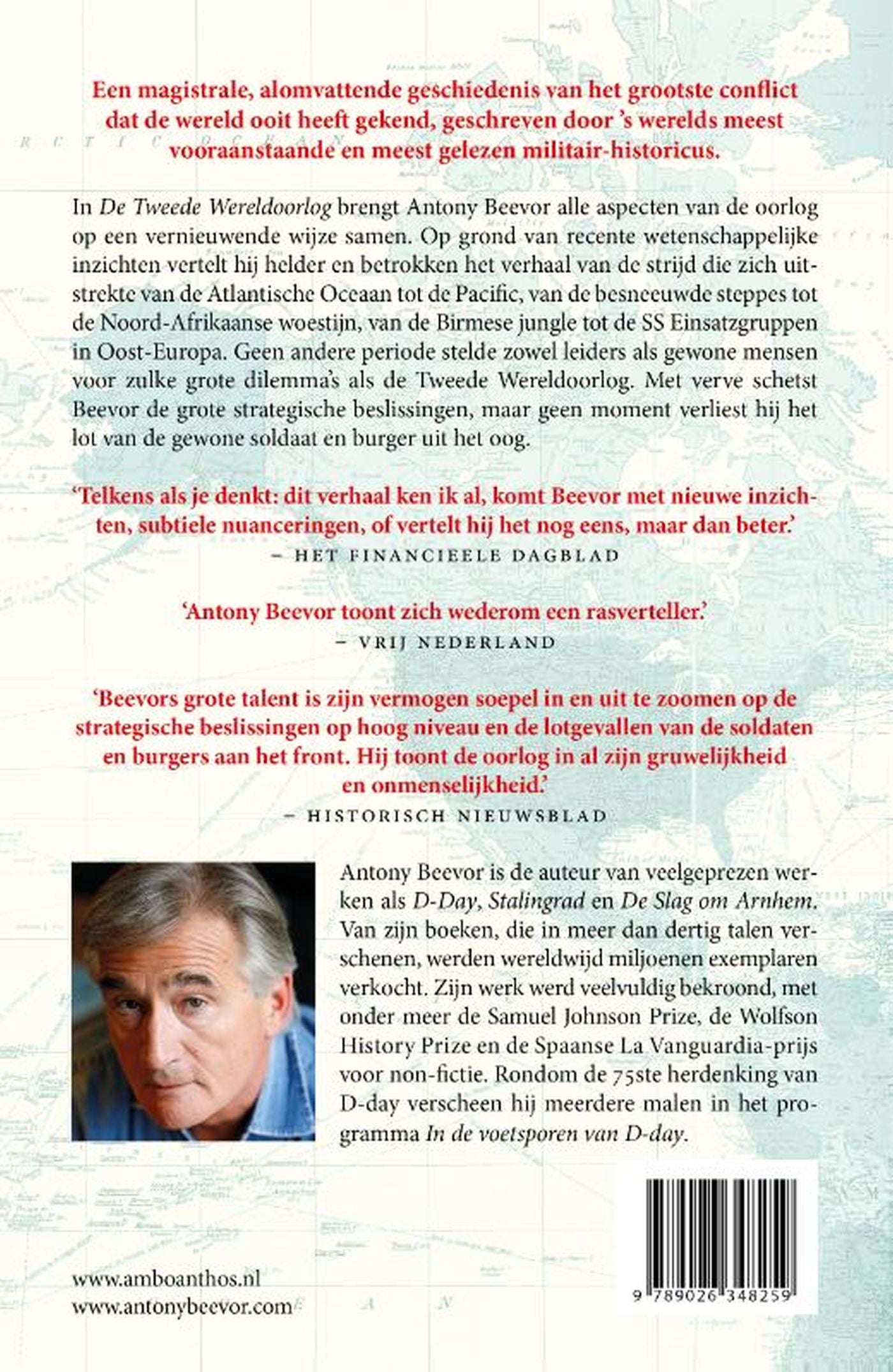 In De Tweede Wereldoorlog brengt Antony Beevor alle aspecten van de oorlog op een vernieuwende wijze samen. Op grond van recente wetenschappelijke inzichten vertelt hij helder en betrokken het verhaal van de strijd die zich uitstrekte van de Atlantische Oceaan tot de Pacific, van de besneeuwde steppes tot de Noord-Afrikaanse woestijn, van de Birmese jungle tot de SS Einsatzgruppen in Oost-Europa. Geen andere periode stelde zowel leiders als gewone mensen voor zulke grote dilemma’s als de Tweede Wereldoorlog. Met verve schetst Beevor de grote strategische beslissingen, maar geen moment verliest hij het lot van de gewone soldaat en burger uit het oog.