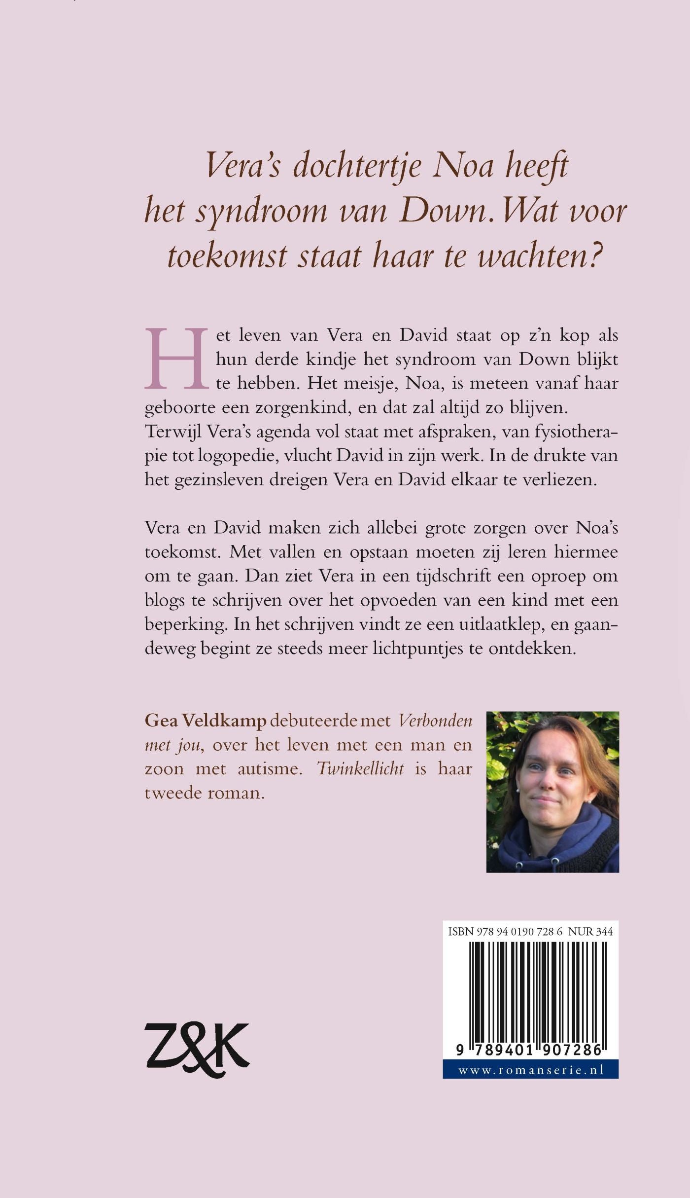 Het leven van Vera en David in Twinkellicht van Gea Veldkamp staat op z’n kop als hun derde kindje het syndroom van Down blijkt te hebben. Het meisje, Noa, is meteen vanaf haar geboorte een zorgenkindje. Terwijl Vera’s agenda vol staat met afspraken, van fysiotherapie tot logopedie, vlucht David in zijn werk. Dan ziet Vera in een tijdschrift een oproep om te schrijven over het opvoeden van een kind met een beperking. Ze parkeert het in haar achterhoofd, tot ze op een nacht niet kan slapen. Dan zet ze de computer aan om haar onrustige gedachten in woorden te vatten. Twinkellicht is de tweede roman van de talentvolle nieuwe auteur Gea Veldkamp.