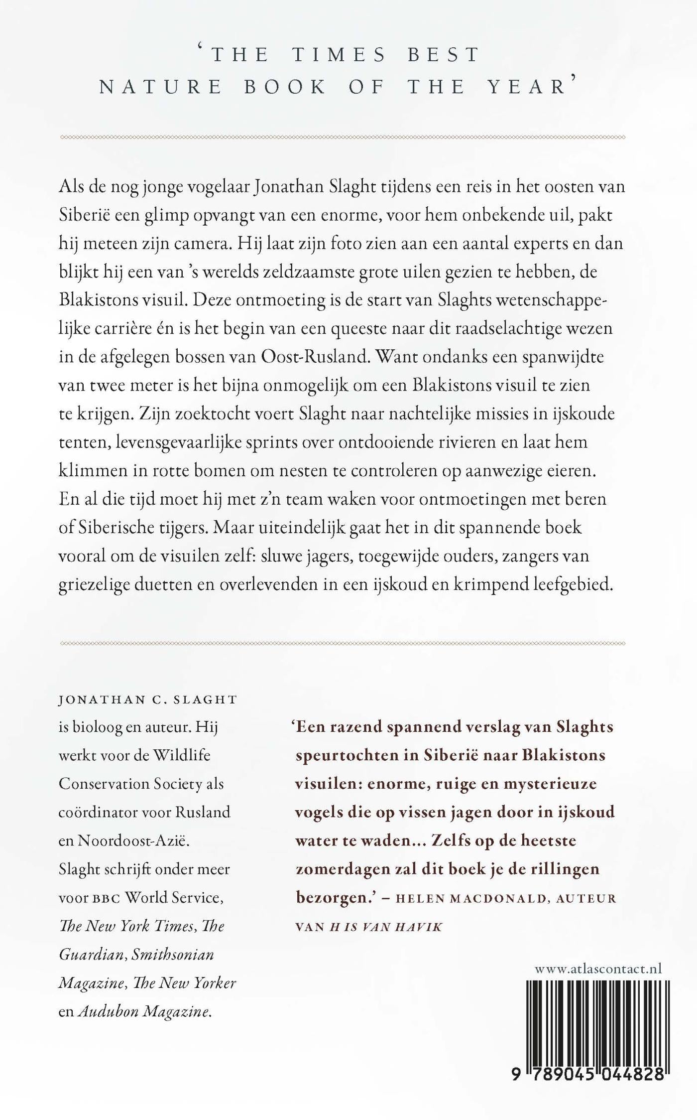 In Uilen van het eeuwige ijs vangt de nog jonge vogelaar Jonathan Slaght tijdens een reis in het oosten van Siberië een glimp op van een enorme, voor hem onbekende uil. Als hij een foto laat zien aan een aantal experts, blijkt hij een van ’s werelds zeldzaamste grote uilen gezien te hebben, de Blakistons visuil. Deze ontmoeting is de start van Slaghts wetenschappelijke carrière én is het begin van een queeste naar dit raadselachtige wezen in de afgelegen bossen van Oost-Rusland. Want ondanks een spanwijdte van twee meter is het bijna onmogelijk om een Blakistons visuil te zien te krijgen. Zijn zoektocht voert Slaght naar nachtelijke missies in ijskoude tenten, levensgevaarlijke sprints over ontdooiende rivieren en laat hem klimmen in rotte bomen om nesten te controleren op aanwezige eieren. En al die tijd moet hij met z’n team waken voor ontmoetingen met beren of Siberische tijgers. Maar uiteindelijk gaat het in dit spannende boek vooral om de visuilen zelf: sluwe jagers, toegewijde ouders, zangers van griezelige duetten en overlevenden in een ijskoud en krimpend leefgebied.