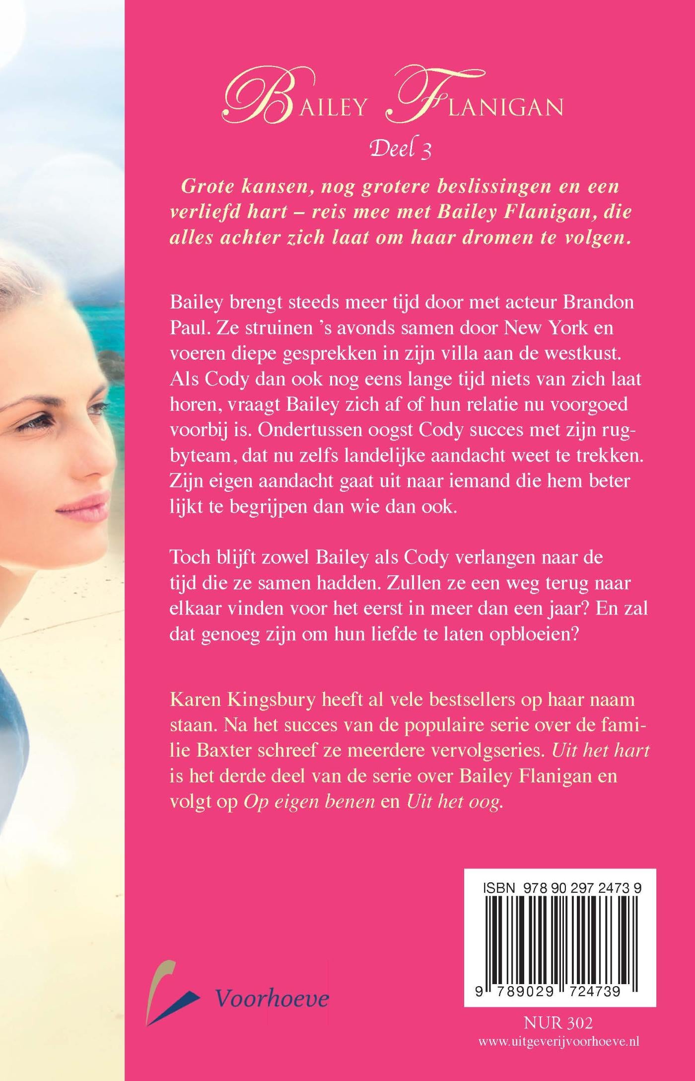‘Uit het hart’ van Karen Kingsbury is het vervolg op ‘Uit het oog’ en het derde deel in de serie over Bailey Flanigan. Balanceerde de relatie tussen Bailey en Cody in de vorige delen al op het randje van de afgrond, nu lijkt het wel alsof het definitief over is tussen de twee. Bailey brengt steeds meer tijd door met acteur Brandon Paul en te midden van het succes van zijn rugbyteam gaat Cody’s aandacht uit naar een vrouw die hem beter lijkt te begrijpen dan wie dan ook. Toch blijft een gevoel van heimwee naar hun tijd samen aan Bailey en Cody trekken. Zal door een kort samenzijn het vuur weer oplaaien? De serie over Bailey Flanigan volgt op de serie ‘Het witte doek’. Ook in deze serie kun je verder lezen over je favoriete personages uit de eerdere romans over de familie Baxter.
