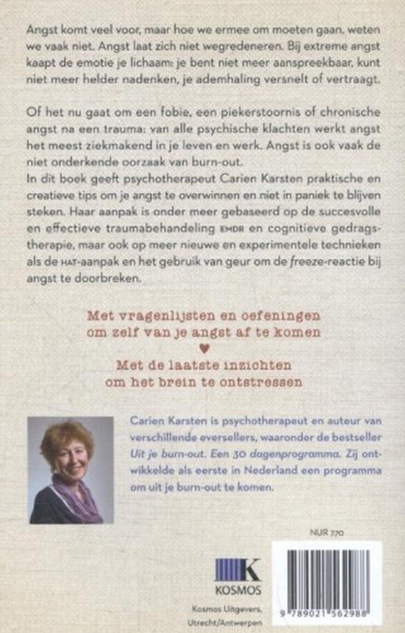 Psycholoog en psychotherapeut Carien Karsten geeft in Uit je angst, in je kracht praktische en creatieve tips om je angst te overwinnen en niet in paniek te blijven steken. Angst komt veel voor, maar hoe we ermee om moeten gaan, weten we vaak niet. Angst laat zich niet wegredeneren. Of het nu gaat om een fobie, een piekerstoornis of chronische angst na een trauma: van alle psychische klachten werkt angst het meest ziekmakend in je leven en werk. Dit boek helpt je om jezelf van angst te bevrijden. De aanpak in dit boek is onder meer gebaseerd op de succesvolle en effectieve traumabehandeling EMDR en cognitieve gedragstherapie, maar ook op de nieuwste neurobiologische inzichten. Een succesvolle aanpak die werkt bij onder andere paniekaanvallen, podiumangst en faalangst.