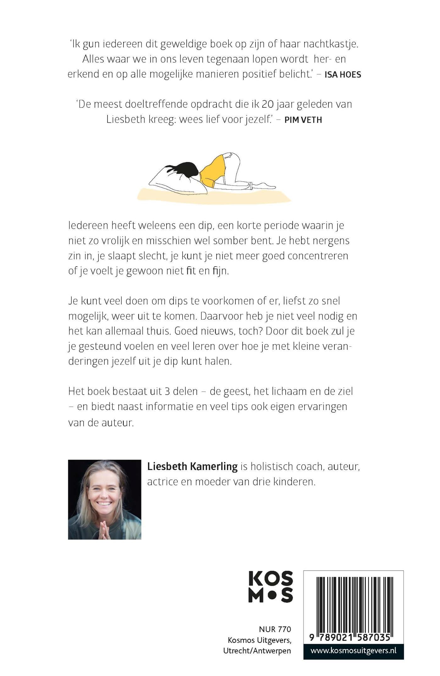 Liesbeth Kamerling geeft in 'Uit je dip gaan' de kleine veranderingen die veel kunnen doen als het leven niet zo lekker loopt. Zij is coach, maar coacht zichzelf ook al van jongs af aan. Ze wéét of ze alles uit zichzelf haalt of niet. Als zij zich niet goed voelt zonder aanwijsbare reden, gaat ze ermee aan de slag. Doordat zij dit al haar hele leven doet, heeft ze veel gelezen, ervaren en ingezien. In dit boek fungeert ze als wegwijzer voor iedereen die even vastloopt. Het boek bestaat uit 3 delen: de geest, het lichaam en de ziel.