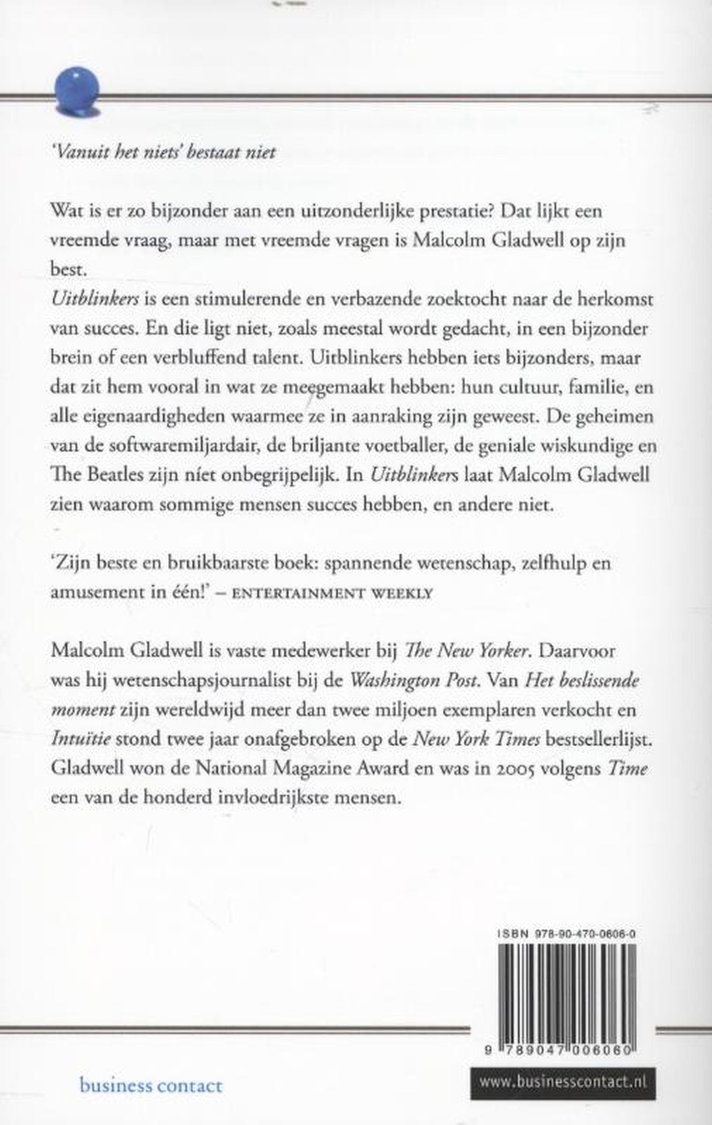 In deze fascinerende en vaak verrassende zoektocht naar de herkomst van succes laat Malcolm Gladwell zien wat iemand een uitblinker maakt, waarom sommige mensen succes hebben en andere niet. Hij onderzoekt waarin de carrière van Bill Gates en de prestaties van voetballers van wereldklasse overeenkomen; wat toppiloten en The Beatles gemeen hebben; waarom zoveel topadvocaten Joods zijn; waarom Aziaten goed zijn in wiskunde; en waarom het juist is om te zeggen dat de wiskundige die de stelling van Fermat oploste geen genie was.