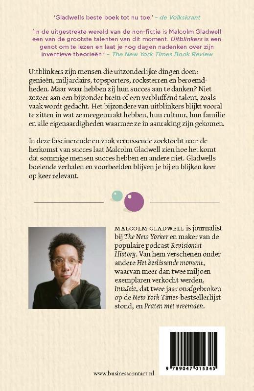 In deze fascinerende en vaak verrassende zoektocht naar de herkomst van succes laat Malcolm Gladwell zien wat iemand een uitblinker maakt, waarom sommige mensen succes hebben en andere niet. Hij onderzoekt waarin de carrière van Bill Gates en de prestaties van voetballers van wereldklasse overeenkomen; wat toppiloten en The Beatles gemeen hebben; waarom zoveel topadvocaten Joods zijn; waarom Aziaten goed zijn in wiskunde; en waarom het juist is om te zeggen dat de wiskundige die de stelling van Fermat oploste geen genie was.