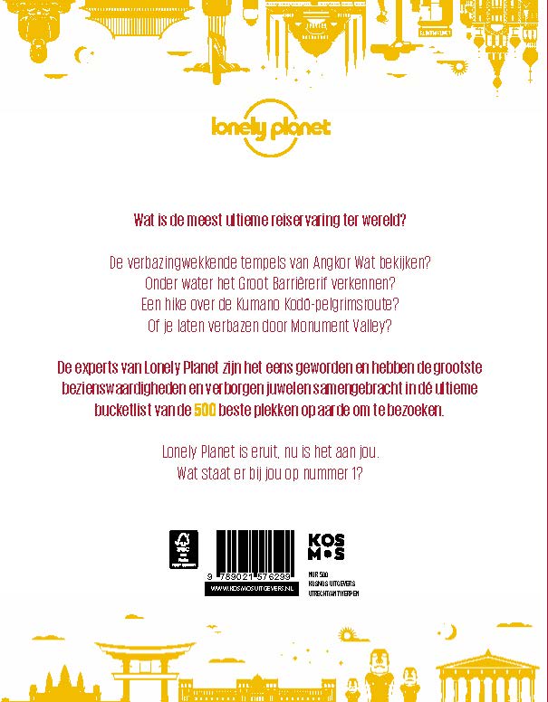 Met 200 nieuwe bestemmingen is dit een volledig geactualiseerde editie van de schitterende Lonely Planet-uitgave ‘Ultieme bestemmingen’. De reisexperts van Lonely Planet stelden de ultieme top 500 op met de beste plekken om naar af te reizen. Deze 500 beste plekken omvatten zowel populaire toeristische trekpleisters als verborgen parels. Denk aan de excentrieke paleizen van Sintra, de verbazingwekkende tempels van Angkor Wat, het Groot Barrièrerif en Monument Valley.