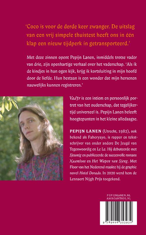 Vad3r van Pepijn Lanen is een zeer intiem portret van het ouderschap, dat tegelijkertijd uiterst actueel en universeel is. Pepijn Lanen beleeft hoogtepunten in het kleine alledaagse. ‘Coco is voor de derde keer zwanger. We zijn in één klap in een nieuw tijdperk beland. De uitslag van een zwangerschapstest heeft ons getransporteerd.’ Met deze zinnen opent Pepijn Lanen, inmiddels trotse vader van drie, zijn openhartige verhaal over het vaderschap. ‘Als ik de kindjes in hun ogen kijk, krijg ik kortsluiting in mijn hoofd door de liefde. Hun bestaan is een wonder dat mijn hersenen nauwelijks kunnen registreren.’