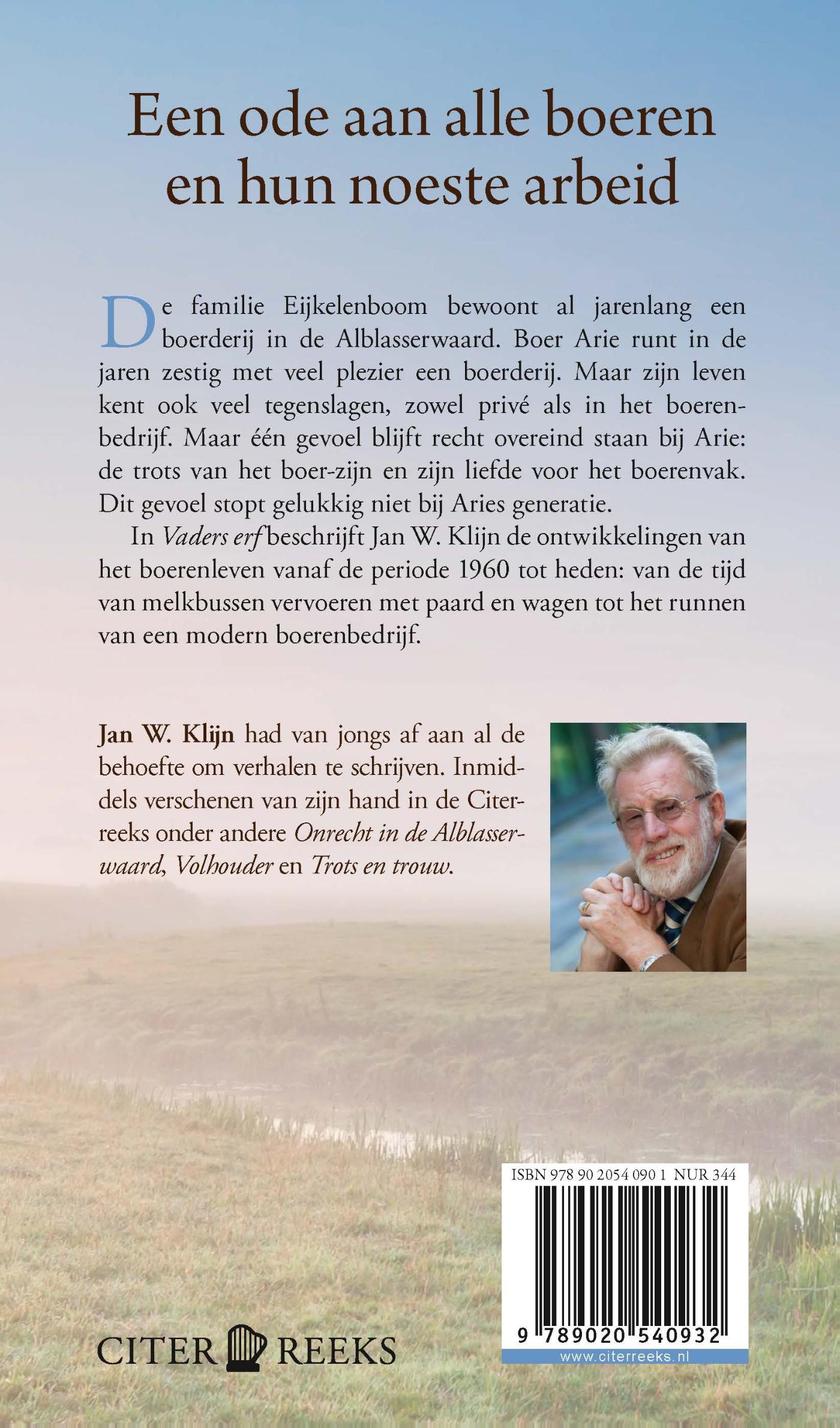 Boer Arie Eijkelenboom, de hoofdpersoon in 'Vaders erf' van Jan W. Klijn, runt in de jaren zestig met veel plezier boerderij De Wijde Blik in de Alblasserwaard. Maar zijn leven kent ook veel tegenslagen, zowel privé als in het boerenbedrijf. Eén gevoel blijft echter recht overeind staan: de trots van het boer-zijn en zijn liefde voor het boerenvak. Dit gevoel stopt gelukkig niet bij Aries generatie. 'Vaders erf' van Jan W. Klijn is een mooie roman over een boerenfamilie en hun standvastigheid en sterke wil om door te gaan.