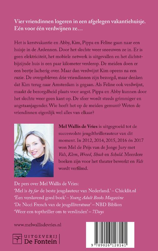 Abby, Maud, Pippa en Feline kennen elkaar van school en zijn al jaren vriendinnen. In de kerstvakantie gaan ze naar een huisje in de Ardennen. Door het slechte weer sneeuwen ze in. Er is geen elektriciteit, het mobiele netwerk is uitgevallen en het dichtstbijzijnde huis is een paar kilometer verderop. De meiden doen er een beetje lacherig over. Maar dan verdwijnt Maud opeens na een ruzie. De overgebleven drie vriendinnen zijn bezorgd, maar denken dat Maud naar het dorp is gelopen. Als Feline ook verdwijnt én ze bloedsporen in de sneeuw vinden, maakt de bezorgdheid plaats voor angst. Pippa en Abby kunnen door het slechte weer geen kant op. De sfeer wordt steeds grimmiger en angstaanjagender. Wie heeft het op de meiden gemunt? Weten de vriendinnen eigenlijk wel alles van elkaar?