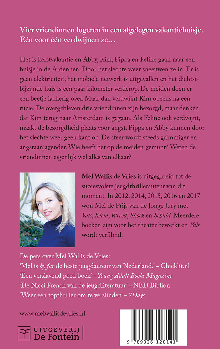 Abby, Maud, Pippa en Feline kennen elkaar van school en zijn al jaren vriendinnen. In de kerstvakantie gaan ze naar een huisje in de Ardennen. Door het slechte weer sneeuwen ze in. Er is geen elektriciteit, het mobiele netwerk is uitgevallen en het dichtstbijzijnde huis is een paar kilometer verderop. De meiden doen er een beetje lacherig over. Maar dan verdwijnt Maud opeens na een ruzie. De overgebleven drie vriendinnen zijn bezorgd, maar denken dat Maud naar het dorp is gelopen. Als Feline ook verdwijnt én ze bloedsporen in de sneeuw vinden, maakt de bezorgdheid plaats voor angst. Pippa en Abby kunnen door het slechte weer geen kant op. De sfeer wordt steeds grimmiger en angstaanjagender. Wie heeft het op de meiden gemunt? Weten de vriendinnen eigenlijk wel alles van elkaar?