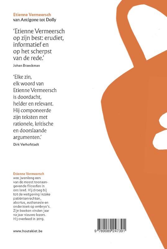 Bij zijn academisch afscheid verzamelden Johan Braeckman & Hugo Van den Enden in 1997 dertien essays van Etienne Vermeersch. De bundel begint met een analyse van de zin van de begrafenis in de Griekse tragedie en eindigt met een essay over de ethische aspecten van dierexperimenten naar aanleiding van het eerste gekloonde schaap Dolly. Dit jaar in mei zou Etienne Vermeersch vijfentachtig geworden zijn. Naar aanleiding daarvan brengt Uitgeverij Houtekiet bijzondere heruitgaven van zijn boeken in een nieuwe vormgeving van Judith Vanistendael en Peter De Roy. ‘Elke zin, elk woord van Etienne Vermeersch is doordacht, helder en relevant. Hij componeerde zijn teksten met rationele, kritische en doorslaande argumenten.’ – Dirk Verhofstadt ‘Etienne Vermeersch op zijn best: erudiet, informatief en op het scherpst van de rede.’ – Johan Braeckman.