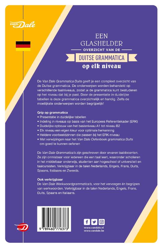 De Van Dale Grammatica Duits geeft je een compleet overzicht van de Duitse grammatica. De onderwerpen worden behandeld op verschillende taalniveaus, zodat je de grammatica kunt bestuderen op het niveau dat bij je past. Door de presentatie in duidelijke tabellen is deze grammatica overzichtelijk en handig. Zelfs de moeilijkste onderwerpen worden begrijpelijk!