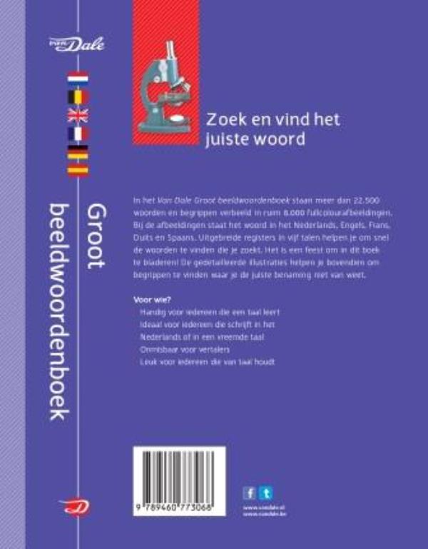 In het Van Dale Groot beeldwoordenboek staan meer dan 22.500 woorden en begrippen verbeeld in ruim 8.000 fullcolourafbeeldingen. Bij de afbeeldingen staat het woord in het Nederlands, Engels, Frans, Duits en Spaans.