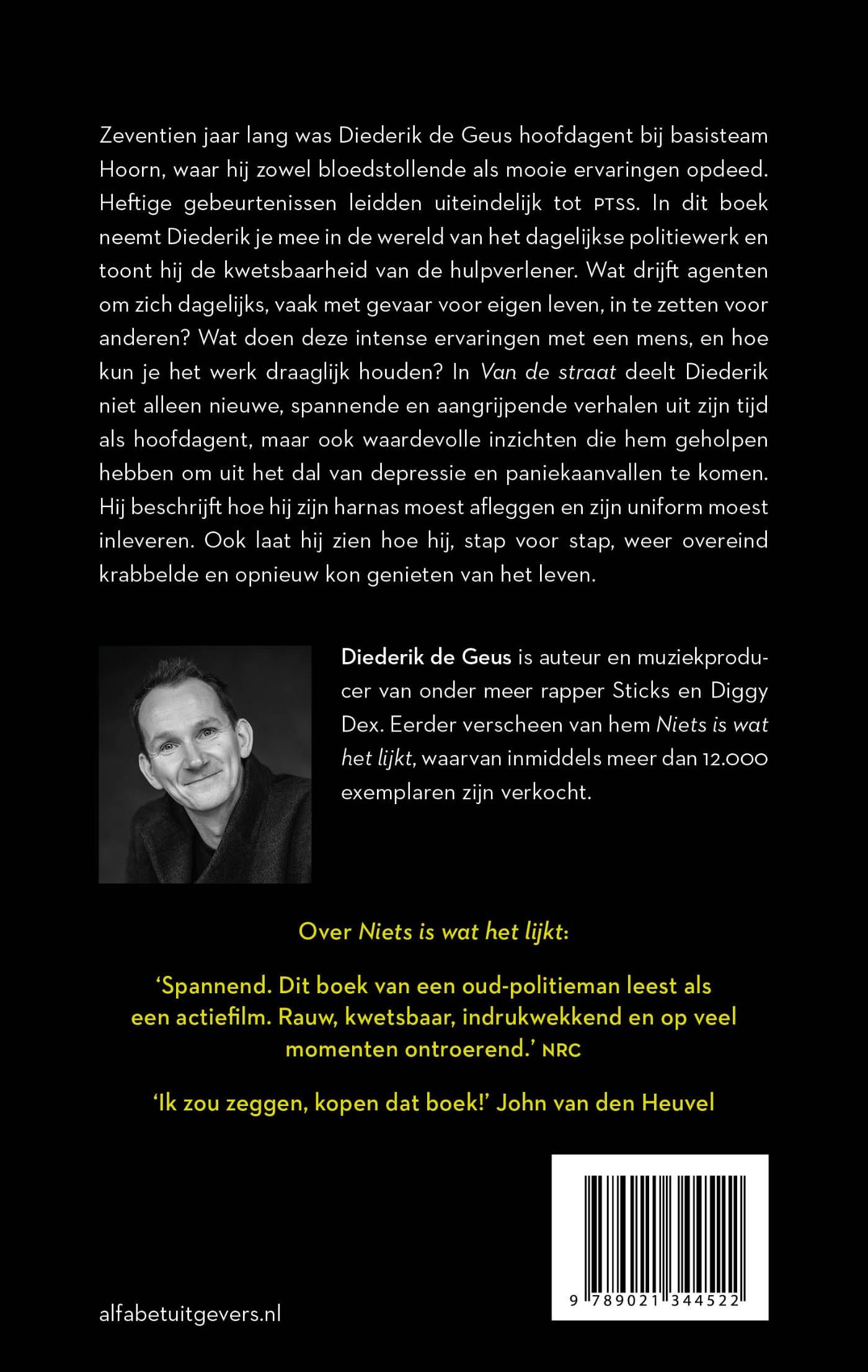 Zeventien jaar lang was Diederik de Geus hoofdagent bij basisteam Hoorn, waar hij zowel bloedstollende als mooie ervaringen opdeed. Heftige gebeurtenissen leidden uiteindelijk tot PTSS. In dit boek neemt Diederik je mee in de wereld van het dagelijkse politiewerk en toont hij de kwetsbaarheid van de hulpverlener. Wat drijft agenten om zich dagelijks, vaak met gevaar voor eigen leven, in te zetten voor anderen? Wat doen deze intense ervaringen met een mens, en hoe kun je het werk draaglijk houden? In Van de straat deelt Diederik niet alleen nieuwe, spannende en aangrijpende verhalen uit zijn tijd als hoofdagent, maar ook waardevolle inzichten die hem geholpen hebben om uit het dal van depressie en paniek aanvallen te komen. Hij beschrijft hoe hij zijn harnas moest afleggen en zijn uniform moest inleveren. Ook laat hij zien hoe hij, stap voor stap, weer overeind krabbelde en opnieuw kon genieten van het leven.