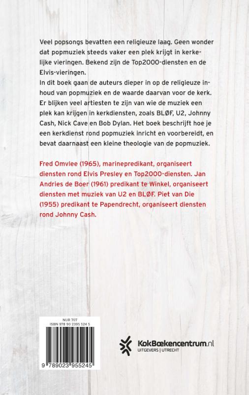 Van Elvis-viering tot U2-dienst van Fred Omvlee, Jan Andries de Boer en Piet van Die beschrijft hoe je een kerkdienst rond popmuziek inricht en voorbereidt. Veel popsongs bevatten een religieuze laag. Geen wonder dat popmuziek steeds vaker een plek krijgt in kerkelijke vieringen. Bekend zijn de Top2000-diensten en de Elvis-vieringen. In dit boek gaan de auteurs dieper in op de religieuze inhoud van popmuziek en de waarde daarvan voor de kerk. Er blijken veel artiesten te zijn van wie de muziek een plek kan krijgen in kerkdiensten, zoals BLØF, U2, Johnny Cash en Bob Dylan. Het boek sluit af met een kleine theologie van de popmuziek.