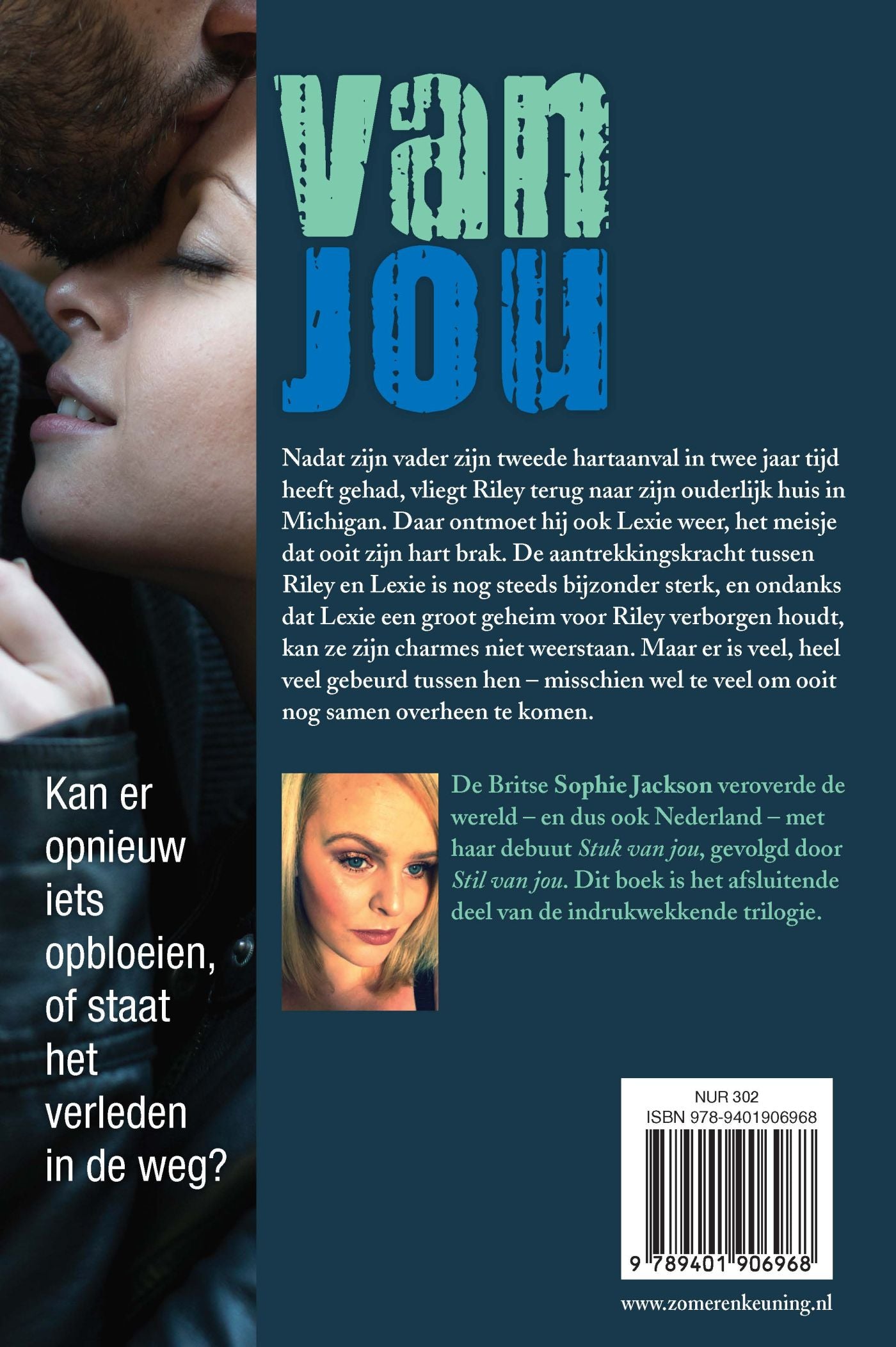 Hartverscheurend, sexy en meeslepend, dat is Van jou van Sophie Jackson. Hoofdpersonen Riley en Lexie zijn al sinds hun vroege jeugd verkikkerd op elkaar, maar het leven heeft hen in een andere richting geleid. Toch kunnen ze elkaar niet vergeten. Als Riley vanwege een ziekenhuisopname van zijn vader terugkeert naar de plaats waar hij opgroeide, moet hij dan ook meteen aan Lexie denken. En het duurt niet lang voordat hij haar ontmoet – en zijn hart opnieuw aan haar verliest. Maar ze hebben allebei heel wat meegemaakt en dat maakt de liefde er niet makkelijker op. Kan er opnieuw iets opbloeien tussen hen, of staat het verleden in de weg? Van jou is het derde deel in de trilogie van de Britse Sophie Jackson waarin eerder al Stuk van jou en Stil van jou verschenen.