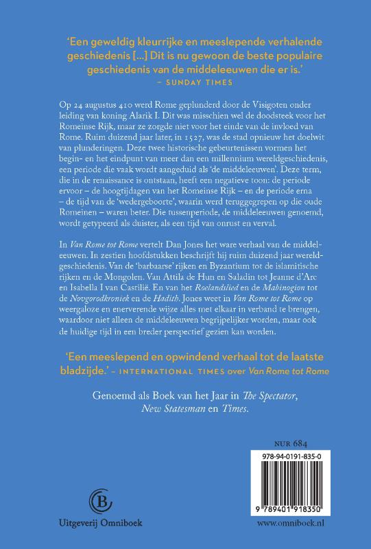 Een duizendjarig avontuur, dat is wat bestsellerauteur Dan Jones maakt van zijn nieuwe geschiedenis van de middeleeuwen ‘Van Rome tot Rome’. Hij begint in 410 bij de ineenstorting van het Romeinse Rijk en eindigt weer in Rome als keizer Karel V in de zestiende eeuw opnieuw voor de poorten van de stad staat. In een duizelingwekkend tempo laat Jones zien hoe het Westen de oude wereld herbouwde en de rest van de wereld ging domineren: door te ontdekken, ontwikkelen of domweg te stelen. ‘Van Rome tot Rome’ is een boek over – en voor – een tijd van diepgaande verandering.