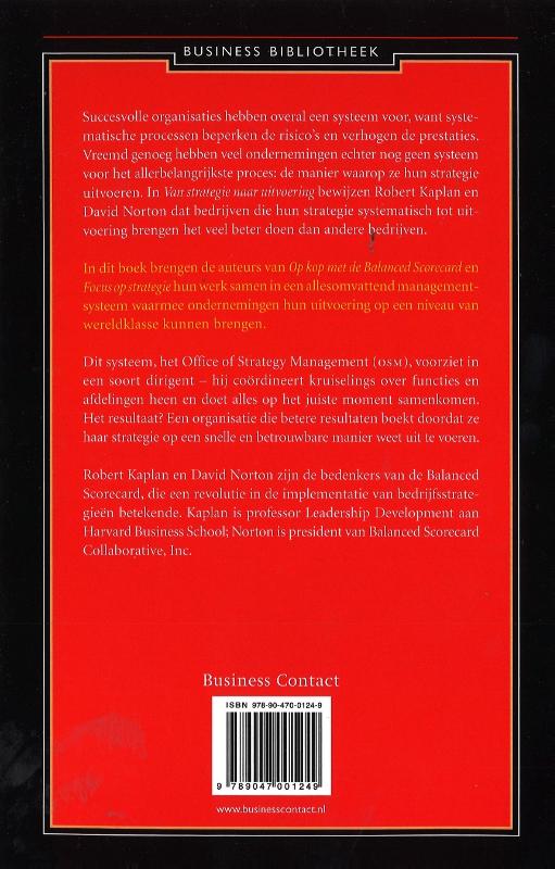 In dit boek brengen de auteurs van Op kop met de Balanced Scorecard en Focus op strategie hun werk samen in een allesomvattend managementsysteem waarmee ondernemingen hun bedrijfsvoering op een niveau van wereldklasse kunnen brengen. Het proces bestaat uit zes stappen, waaronder; strategie ontwikkelen door doelen te verhelderen, afdelingen en medewerkers op één lijn brengen met je strategie, controleren en lering trekken van actie en strategie, strategie testen en aanpassen.