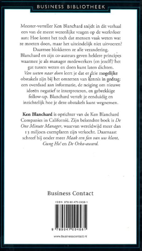Van weten naar doen leert je dat er drie mogelijke obstakels zijn bij het omzetten van kennis in gedrag: een overdaad aan informatie, de neiging om nieuwe ideeën negatief te interpreteren, en gebrekkige follow-up. Blanchard vertelt je eenduidig en inzichtelijk hoe je deze obstakels kunt wegnemen.