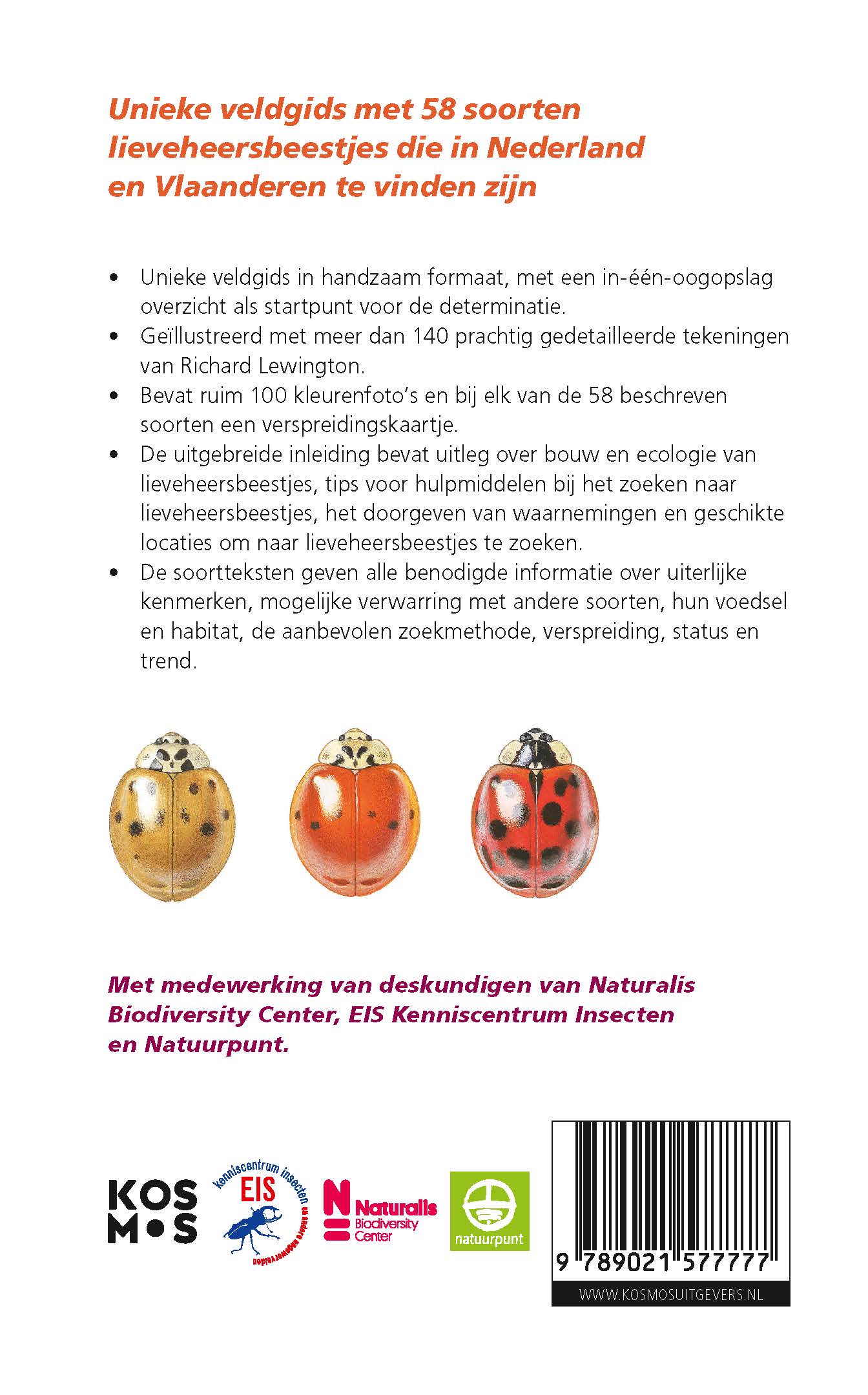 De ‘Veldgids lieveheersbeestjes voor Nederland en Vlaanderen’ is een unieke veldgids in handzaam formaat, die is samengesteld en geschreven door Helen Roy en Peter Brown. Hij bevat maar liefst 58 soorten lieveheersbeestjes die in Nederland en Vlaanderen te vinden zijn. De soortpagina’s zijn overzichtelijk ingedeeld met heldere informatie over uiterlijke kenmerken, voedsel, habitat, aanbevolen zoekmethode, verspreiding, status en trend. Soorten die vaak met elkaar verward worden staan naast elkaar afgebeeld, met aandacht voor de onderlinge verschillen. Geïllustreerd met meer dan 140 prachtig gedetailleerde tekeningen van Richard Lewington. Voor de echte lieveheersbeestjesliefhebber!