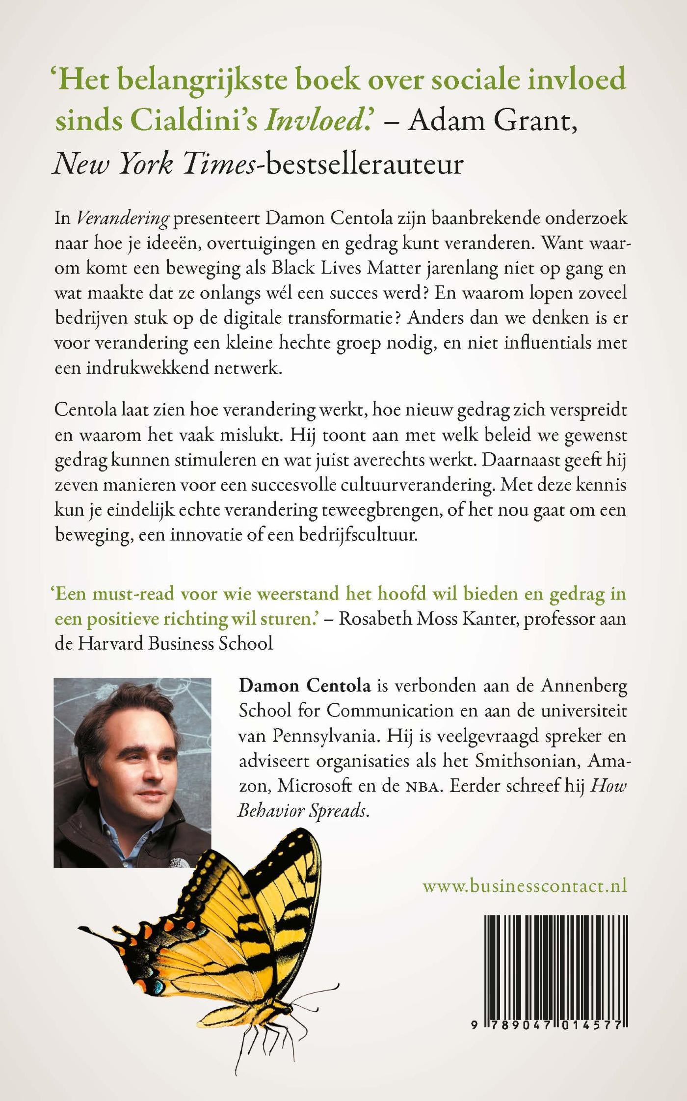 Centola laat zien hoe verandering werkt, hoe nieuw gedrag zich verspreidt en waarom het vaak mislukt. Hij toont aan met welk beleid we gewenst gedrag kunnen stimuleren en wat juist averechts werkt. Daarnaast geeft hij zeven manieren voor een succesvolle cultuurverandering. Met de kennis van ‘Verandering’ kun je eindelijk echte verandering teweegbrengen, of het nou gaat om een beweging, een innovatie of een bedrijfscultuur.