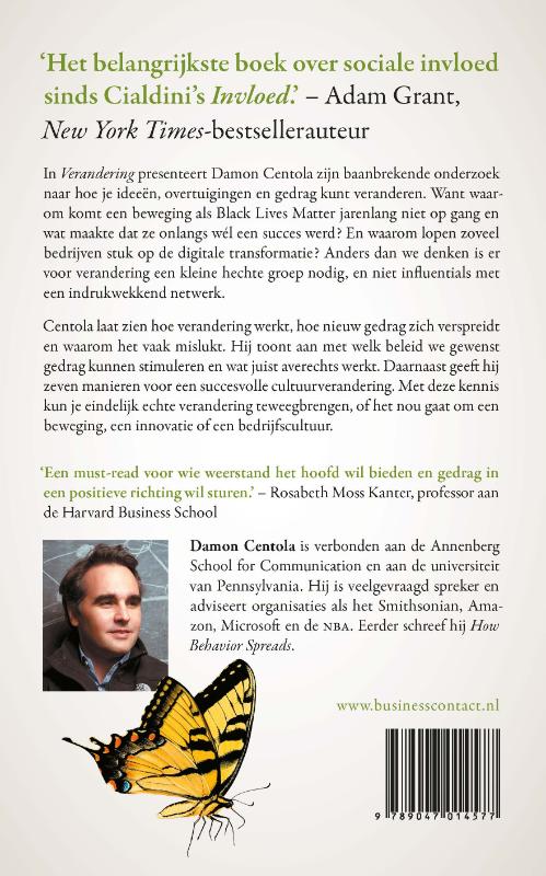 In ‘Verandering’ laat Damon Centola zien hoe verandering werkt en hoe nieuw gedrag zich verspreidt. Zijn baanbrekende onderzoek toont aan met welk beleid we gewenst gedrag kunnen stimuleren en wat juist averechts werkt. Daarnaast geeft hij zeven manieren voor een succesvolle cultuurverandering. Want anders dan we denken is er voor verandering een kleine hechte groep nodig, en niet influencers met een indrukwekkend netwerk. Met de kennis van ‘Verandering’ kun je eindelijk echte verandering teweegbrengen, of het nou gaat om een beweging, een innovatie of een bedrijfscultuur.