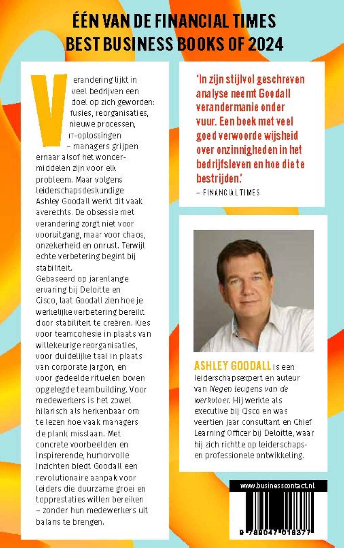 Verandering lijkt in veel bedrijven een doel op zich geworden: fusies, reorganisaties, nieuwe processen, it-oplossingen managers grijpen ernaar alsof het wondermiddelen zijn voor elk probleem. Maar volgens leiderschapsdeskundige Ashley Goodall werkt dit vaak averechts. De obsessie met verandering zorgt niet voor vooruitgang, maar voor chaos, onzekerheid en onrust. Terwijl echte verbetering begint bij stabiliteit.