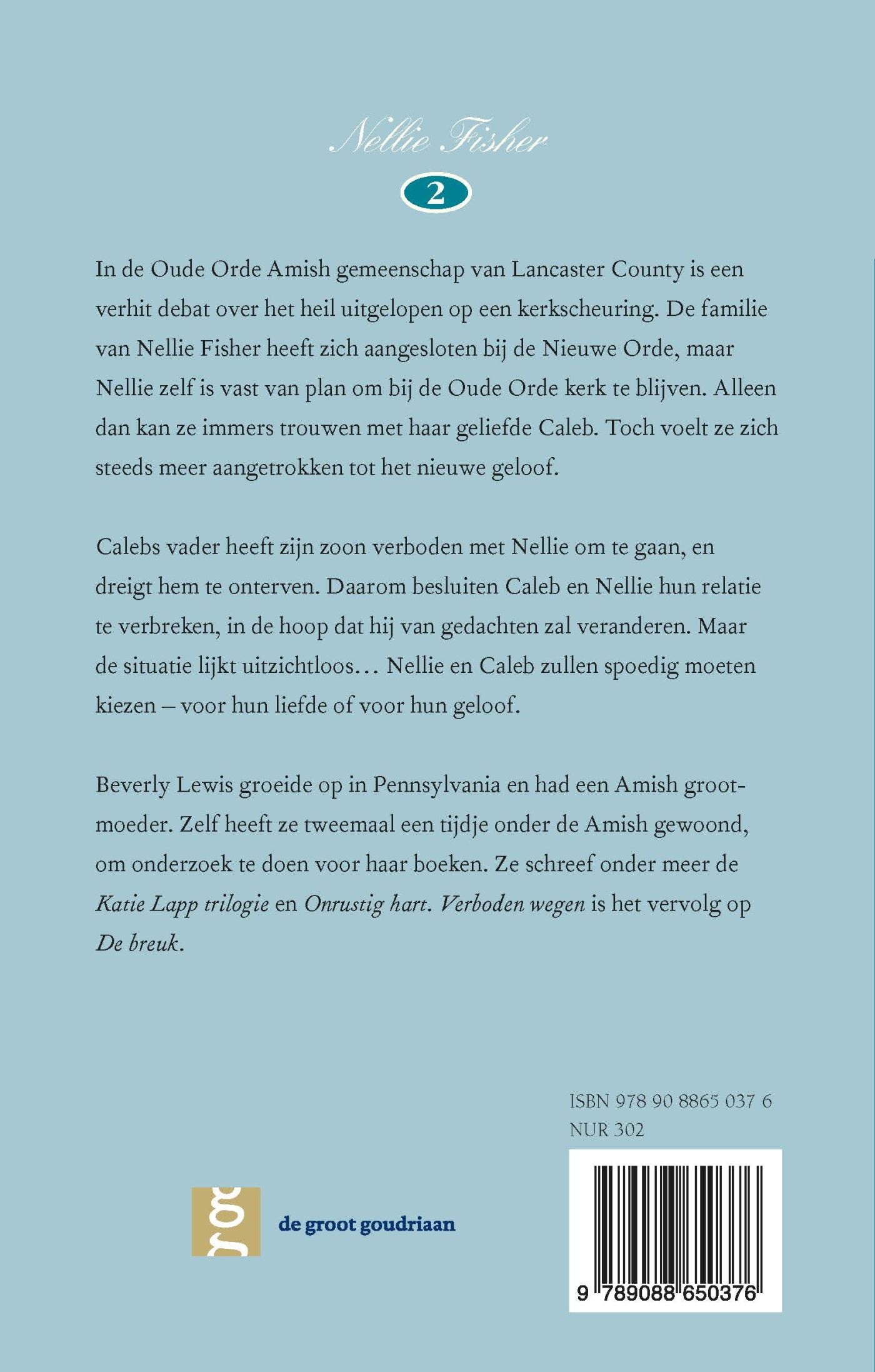 Deel 2 `Verboden wegen`. De populaire Nellie Fisher-serie van de Amerikaanse schrijfster Beverly Lewis is nu gebundeld in een trilogie. Hoofdpersoon Nellie Fisher bevindt zich in een moeilijke positie als haar familie overweegt zich af te scheiden van de Amish-kerk. Als dat gebeurt, verliest Nellie haar geliefde Caleb. Hij houdt namelijk vast aan de wegen van de Old Order-gemeenschap. Maar als Nellie voor Caleb kiest, moet ze haar familie loslaten. Is er een uitweg voor haar dilemma? De Nellie Fisher trilogie van Beverly Lewis bevat de titels De breuk, Verboden wegen en Diepste verlangen.