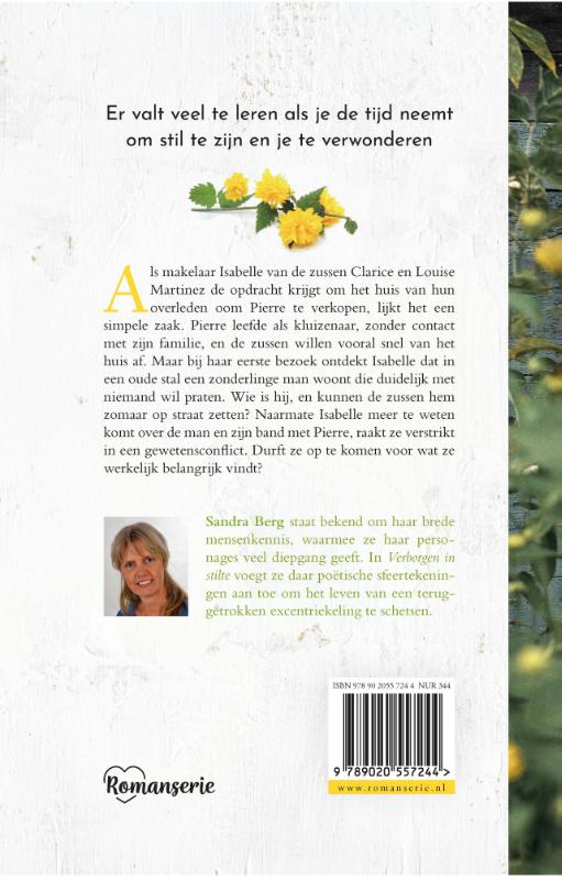 Verborgen in stilte van Sandra Berg is een warm verhaal vol poëtische sfeerimpressies. Makelaar Isabelle krijgt van zussen Clarice en Louise de opdracht het huis van hun overleden oom Pierre te verkopen. Hij leefde als een kluizenaar en ze hadden nauwelijks contact met hem. Maar bij haar eerste bezoek ontdekt Isabelle dat in een oude stal achter het huis een eigenaardige man woont, die duidelijk met niemand wil praten. Wie is hij, en kunnen de zussen hem zomaar op straat zetten? Naarmate Isabelle meer te weten komt over de man en zijn band met Pierre, raakt ze verstrikt in een gewetensconflict. Durft ze op te komen voor wat ze werkelijk belangrijk vindt?