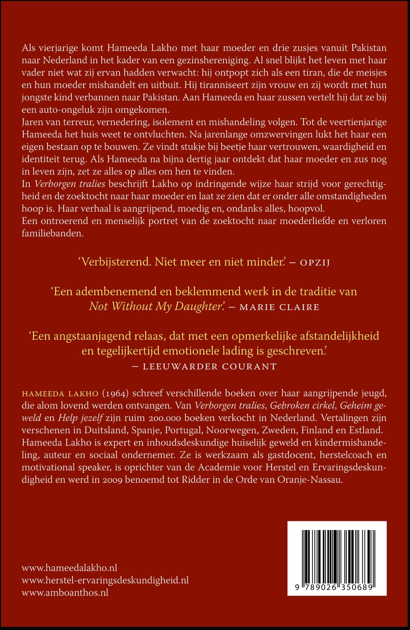 Verborgen tralies vertelt het aangrijpende verhaal van Hemeeda Lakho’s gewelddadige jeugd en de persoonlijke zoektocht die daarop volgde. Het is 1968 en Hameeda Lakho komt op vierjarige leeftijd vanuit Pakistan naar Rijswijk. Wanneer haar vader zijn vrouw en hun jongste kind terug naar Pakistan stuurt, vertelt hij Hameeda dat ze bij een auto-ongeluk zijn omgekomen. Jaren van terreur, vernederingen, isolement en mishandeling volgen. Tot de veertienjarige Hameeda het huis weet te ontvluchten. Ze herstelt langzaam en vindt haar eigen identiteit. Als Hameeda na dertig jaar ontdekt dat haar moeder nog leeft, besluit ze terug te keren naar haar geboorteland, op zoek naar haar moeder.