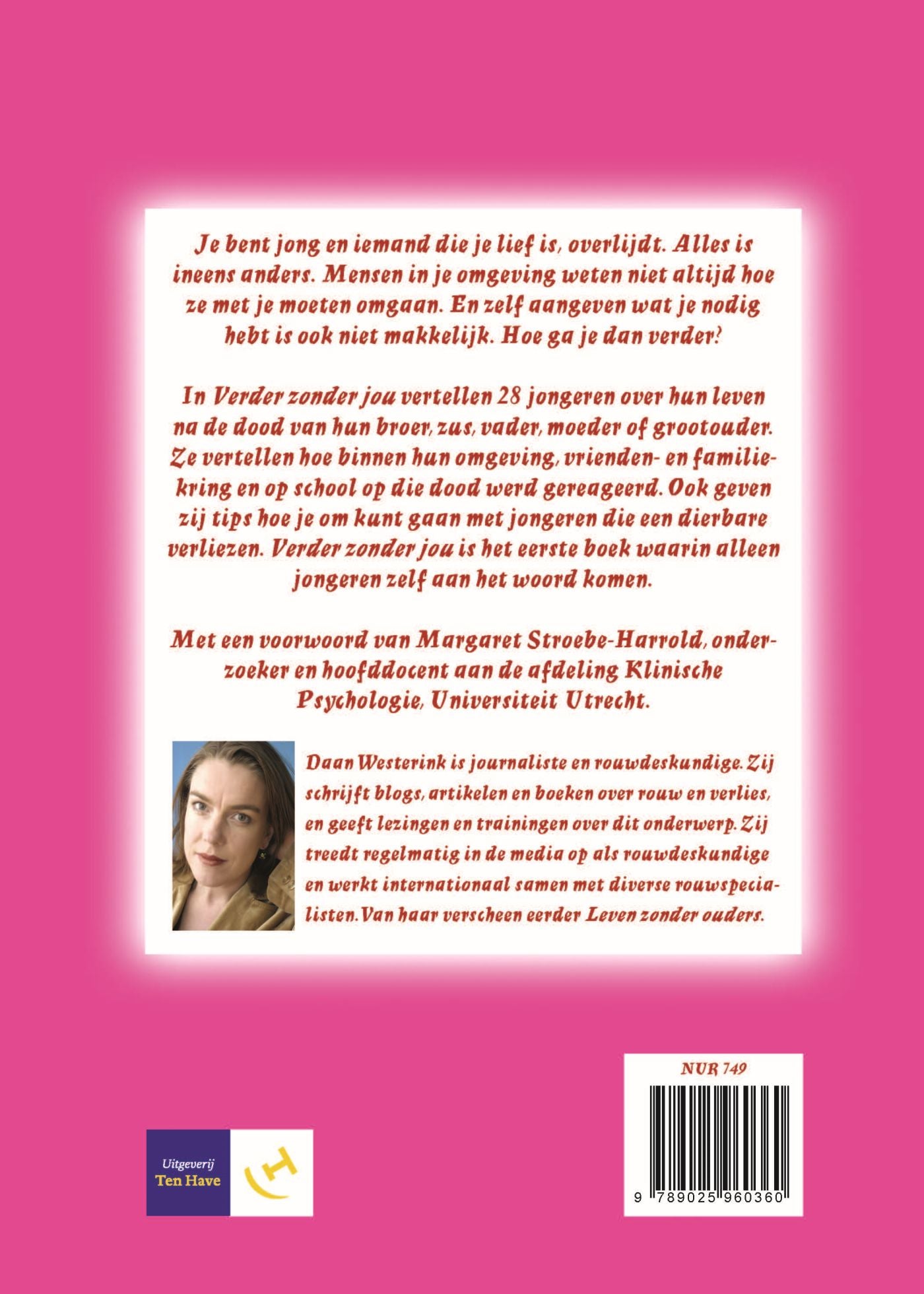 In Verder zonder jou vertellen 28 jongeren over hun leven na de dood van hun broer, zus, vader, moeder of grootouder. Ze vertellen hoe binnen hun omgeving, vrienden- en familiekring en op school op die dood werd gereageerd. Ook geven zij tips hoe je om kunt gaan met jongeren die een dierbare verliezen.