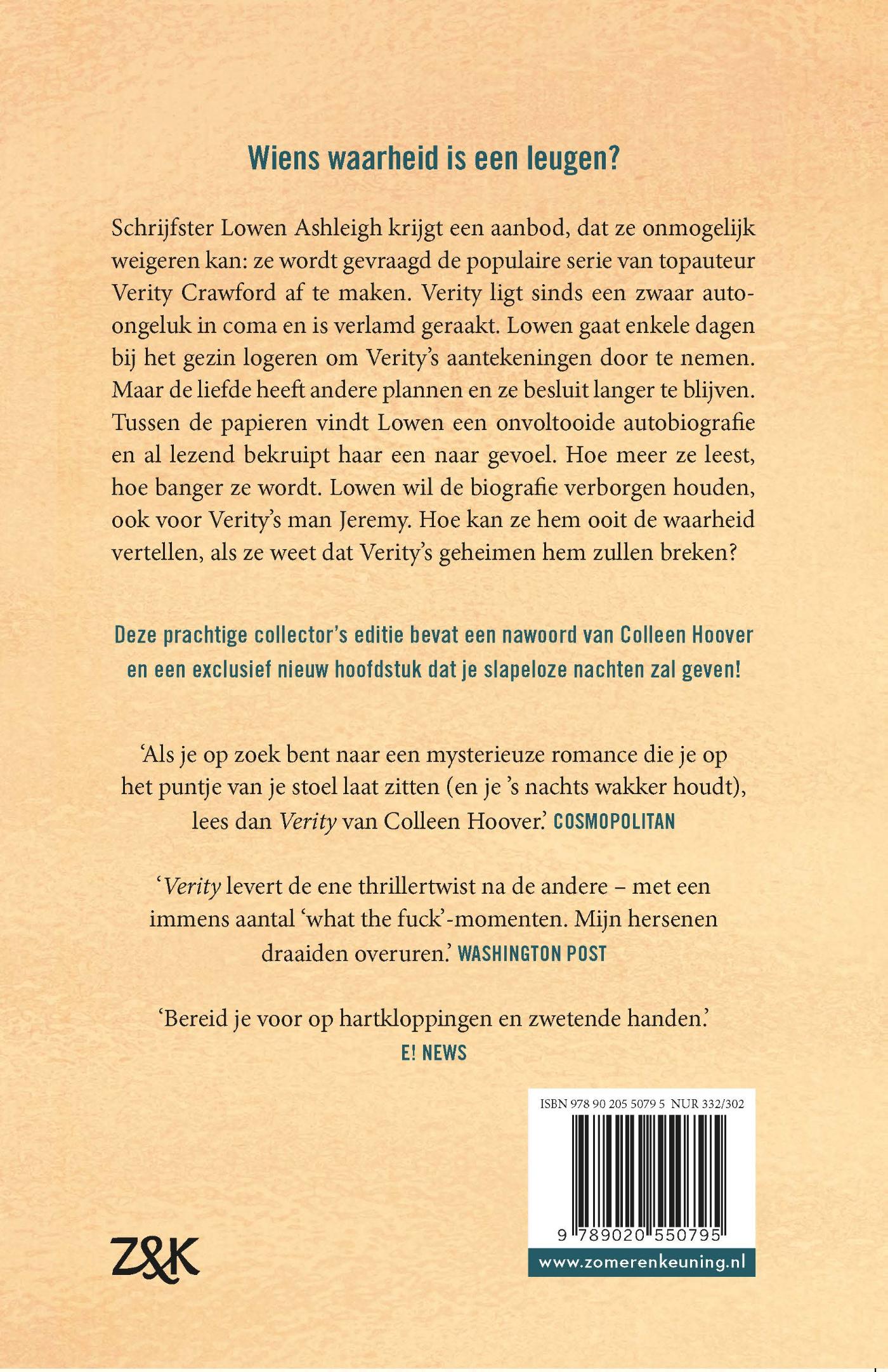 De spannende NA-thriller 'Verity' van Colleen Hoover gaat over schrijfster Lowen. Ze kan nauwelijks rondkomen, tot ze de kans van haar leven krijgt: ze mag de populaire boekenserie van Verity Crawford voltooien, die door een auto-ongeluk zelf niet meer kan schrijven. Als Lowen door Verity’s aantekeningen gaat, ontdekt ze een ongepubliceerde autobiografie die verborgen had moeten blijven. Ze besluit om het verhaal verborgen te houden, ook voor Verity’s man Jeremy. Maar dan krijgt ze gevoelens voor Jeremy. Hoelang kan Lowen de waarheid voor zich houden?