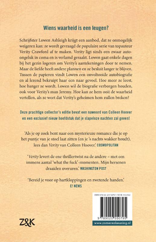 De spannende NA-thriller 'Verity' van Colleen Hoover gaat over schrijfster Lowen. Ze kan nauwelijks rondkomen, tot ze de kans van haar leven krijgt: ze mag de populaire boekenserie van Verity Crawford voltooien, die door een auto-ongeluk zelf niet meer kan schrijven. Als Lowen door Verity’s aantekeningen gaat, ontdekt ze een ongepubliceerde autobiografie die verborgen had moeten blijven. Ze besluit om het verhaal verborgen te houden, ook voor Verity’s man Jeremy. Maar dan krijgt ze gevoelens voor Jeremy. Hoelang kan Lowen de waarheid voor zich houden?